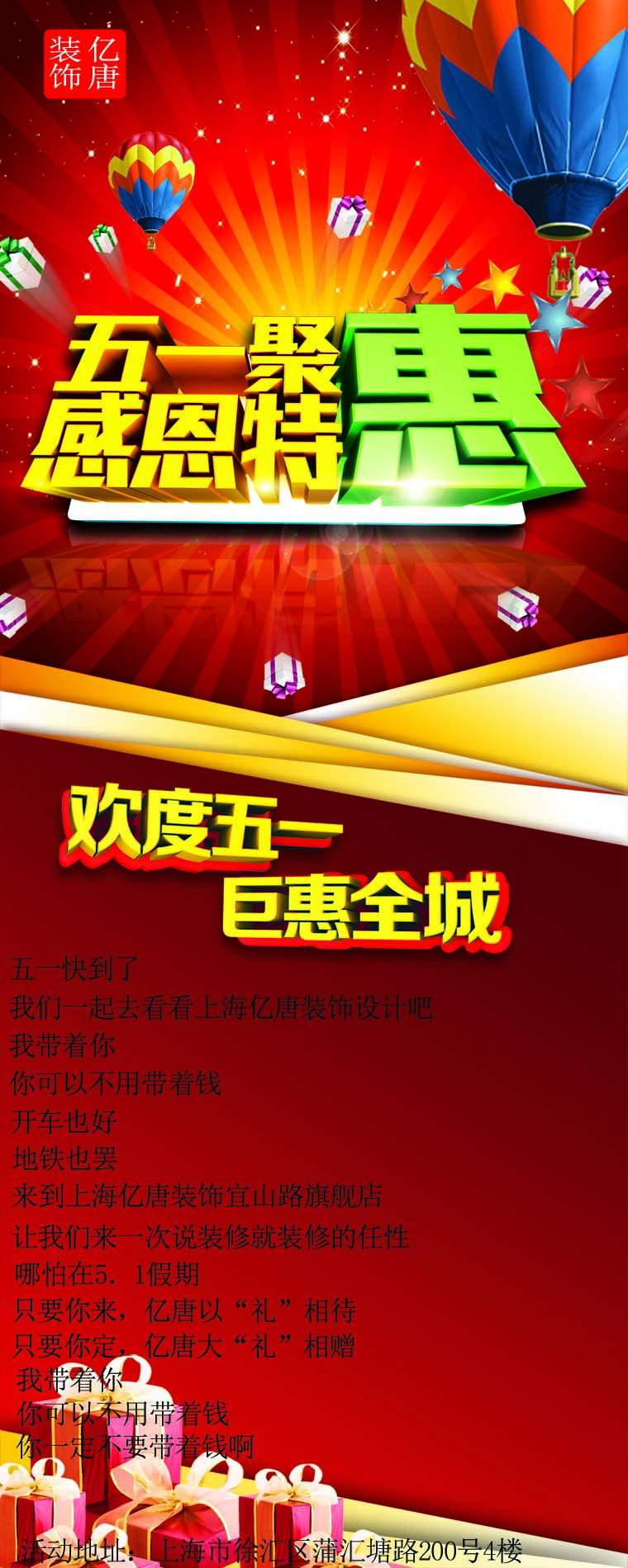 特此在五一劳动节之际,亿唐装饰特别回馈老客户,凡在2015年5月1日至2015年5月7日与我们签订设计暨装修装饰施工合同的客户,我们将特别送出五一大礼包优惠: