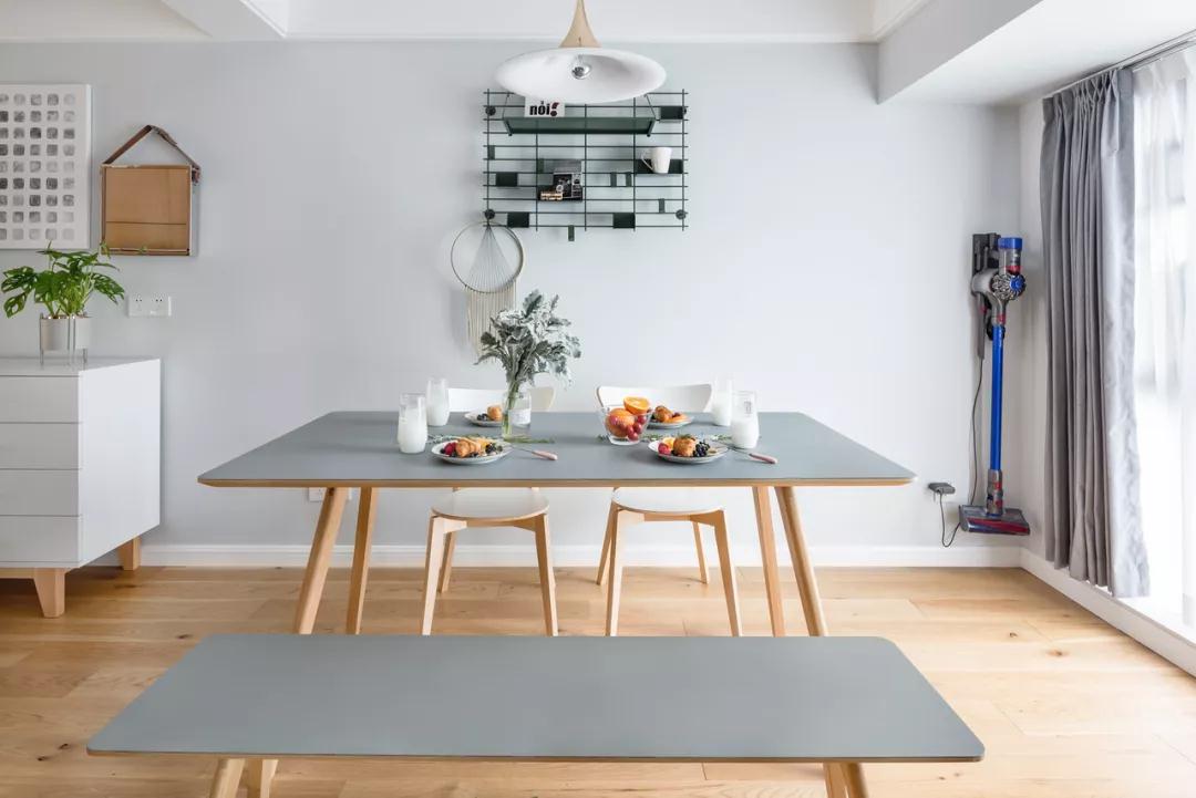 ▲餐厅木质的餐桌椅与板凳,在餐桌与板凳的台面是灰色的,而餐椅的坐席位置则是白色的,搭配背景墙的收纳架绿植点缀,呈现出一种清新简约的舒适氛围。