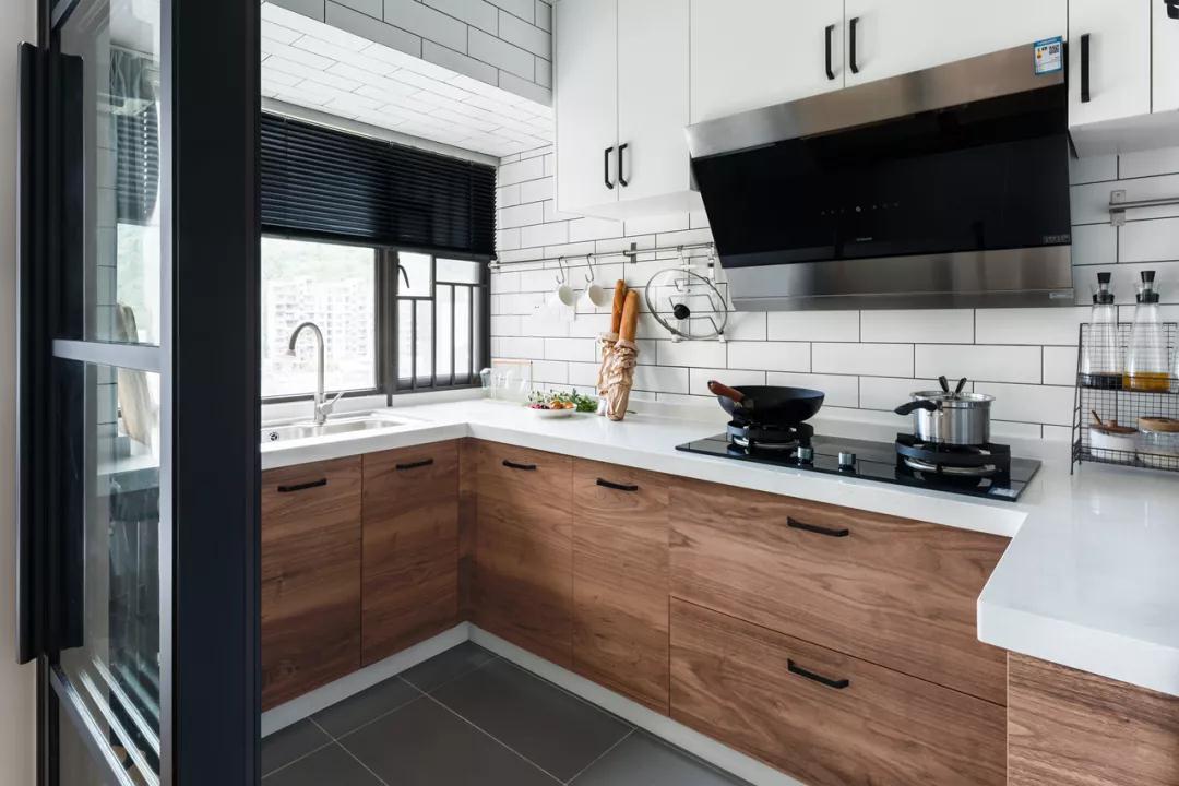 ▲在白色工字砖的墙面基础,装上一个木质的定制橱柜,让做饭炒菜空间也显得文艺轻松自然。