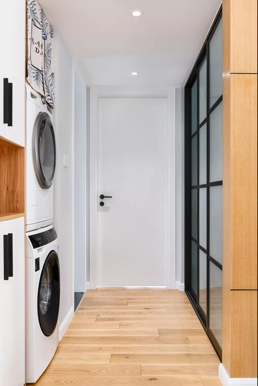 ▲没有阳台晒衣物,在紧凑的户型内把洗衣机烘干机放置在走廊位置,保障其他空间相对宽裕舒适。