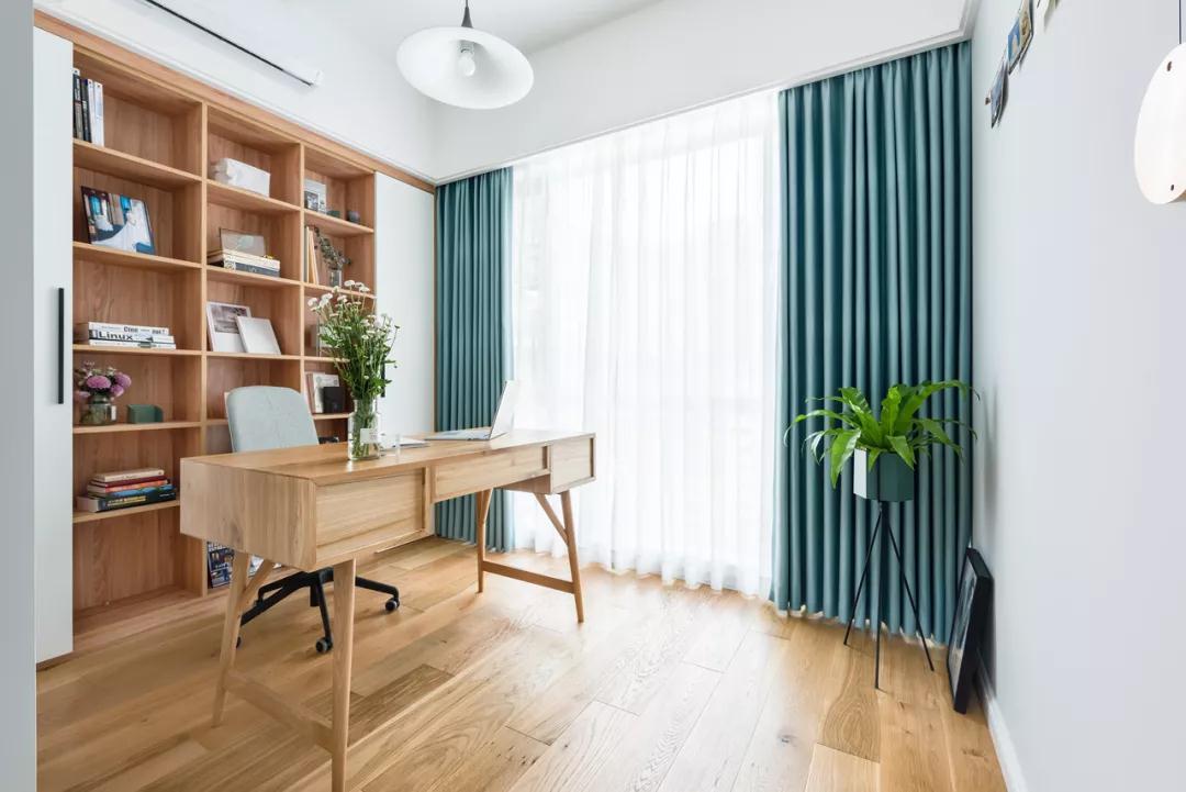 ▲原木质感的木地板、书桌与书架,布置上绿植的点饰,置身这个书房办公加班,心情惬意舒适好自然。