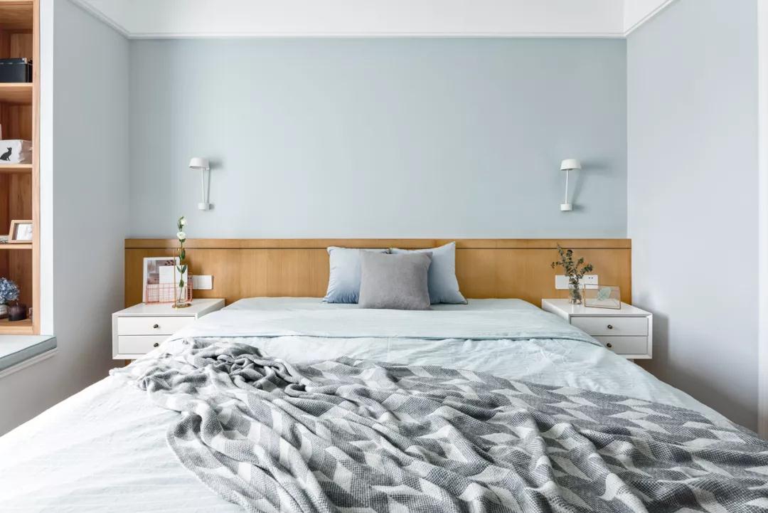 ▲卧室的床头墙墙脚区域装上护墙板,边上白色的床头柜设计,整体空间简约自然而清新。