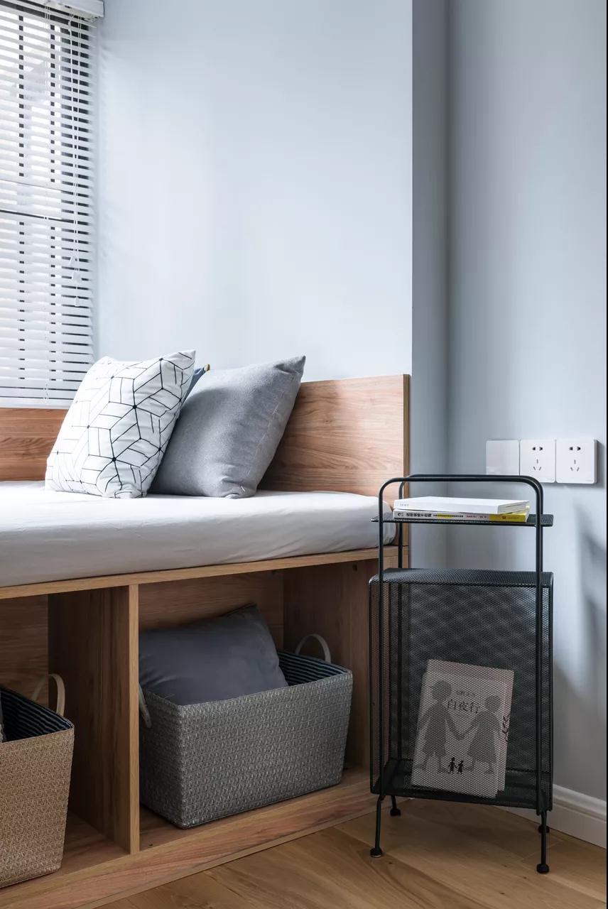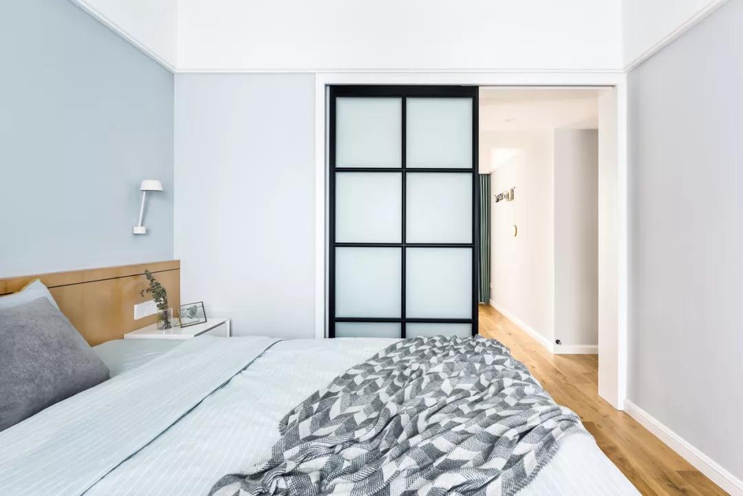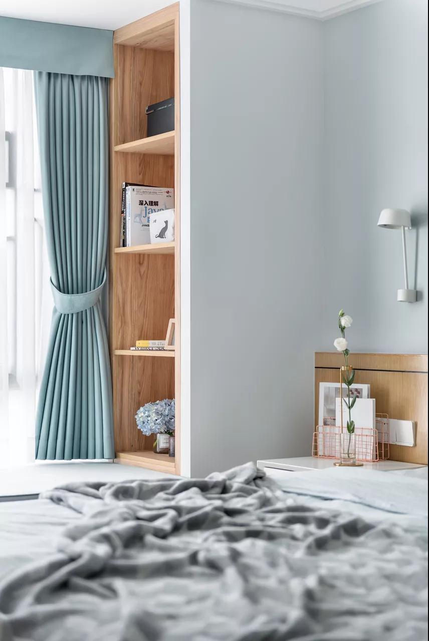▲淡灰色的墙面,还有灰蓝色的床单与窗帘,也增添了空间的简约视觉感。