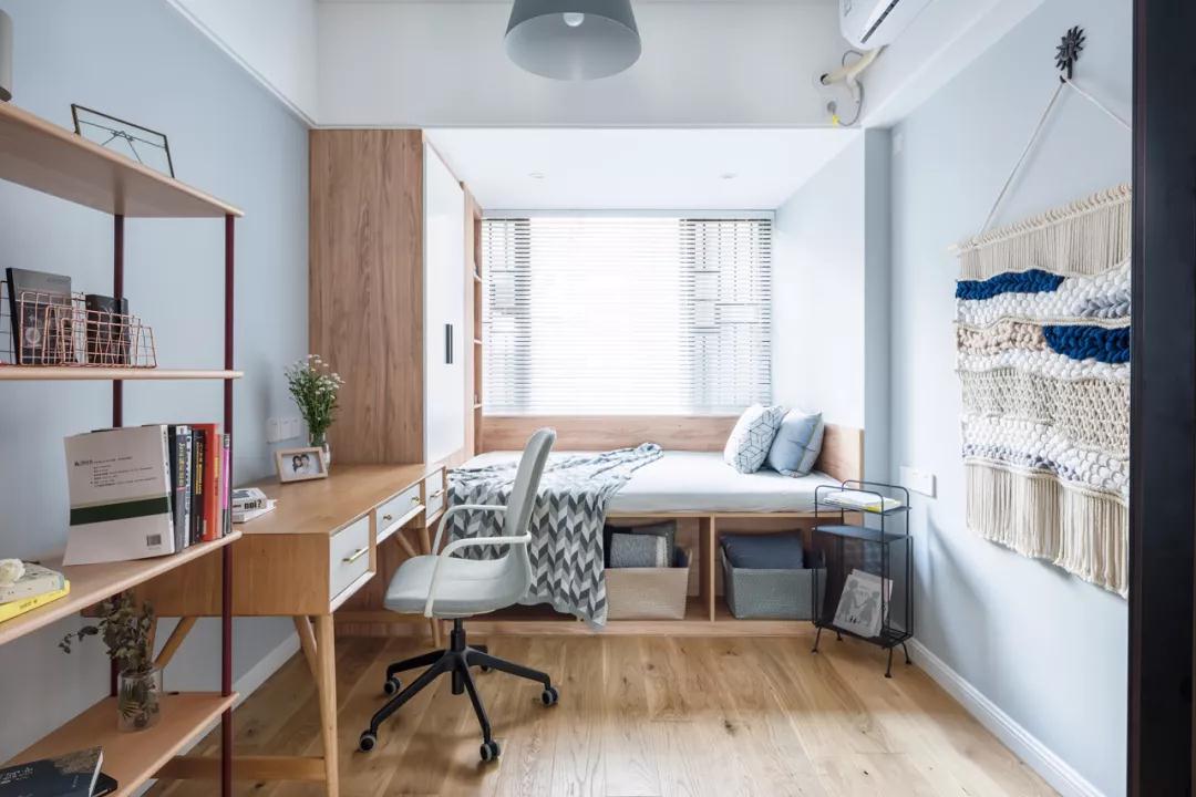 ▲客服布置了一张书桌,靠窗结合飘窗定制了一张床头,床底也是实用的收纳格,带来的是丰富情趣的收纳。