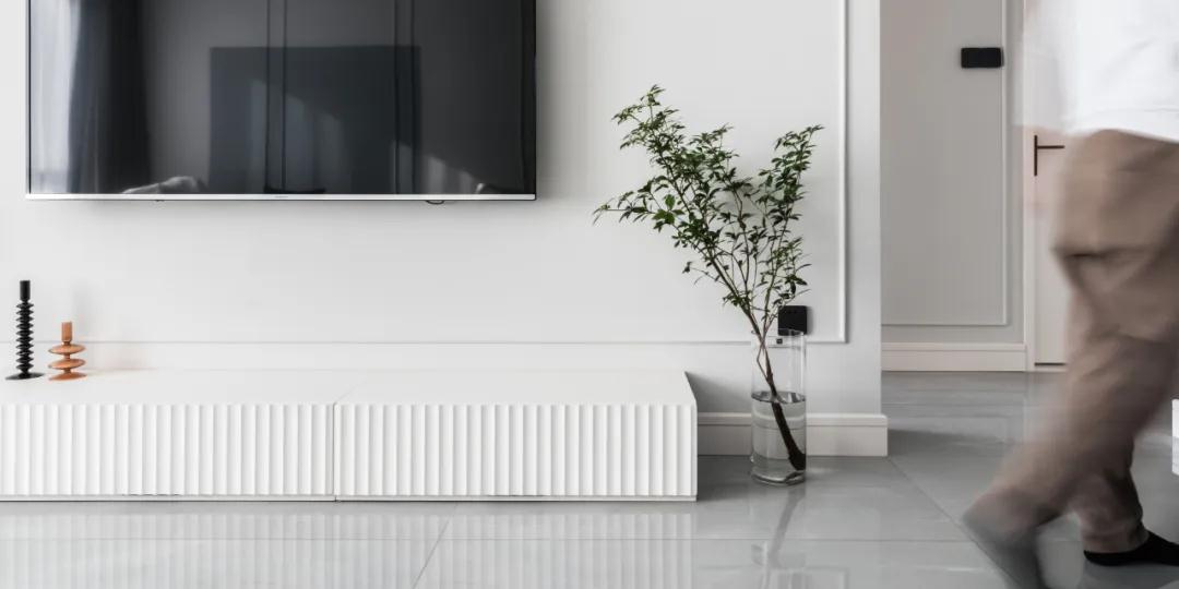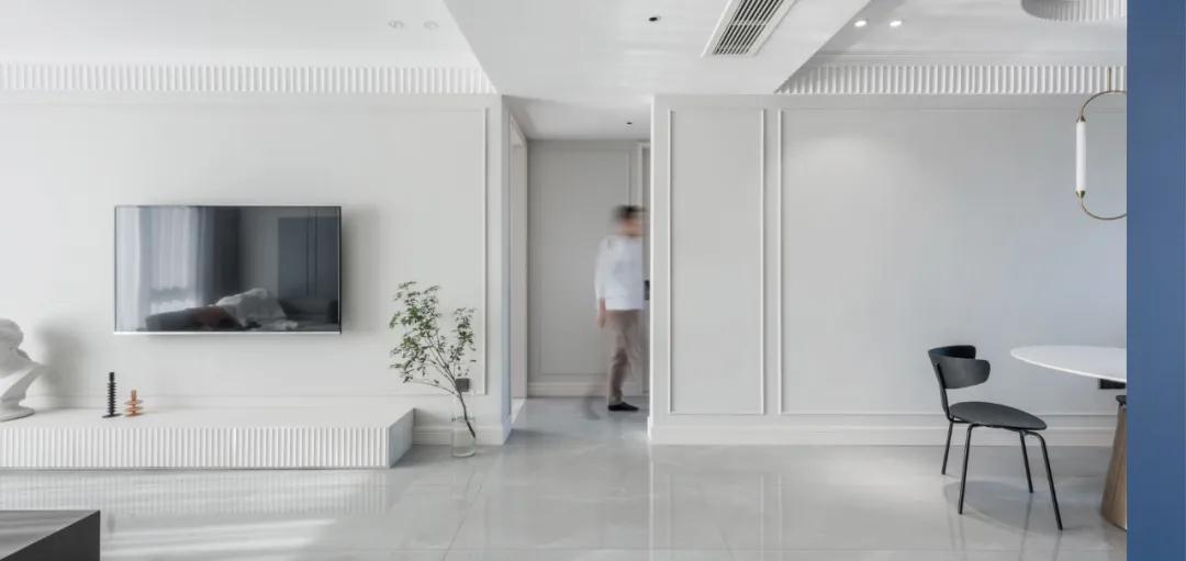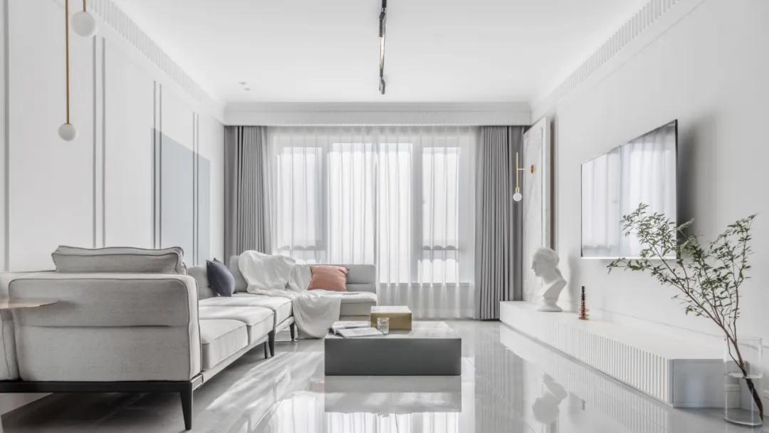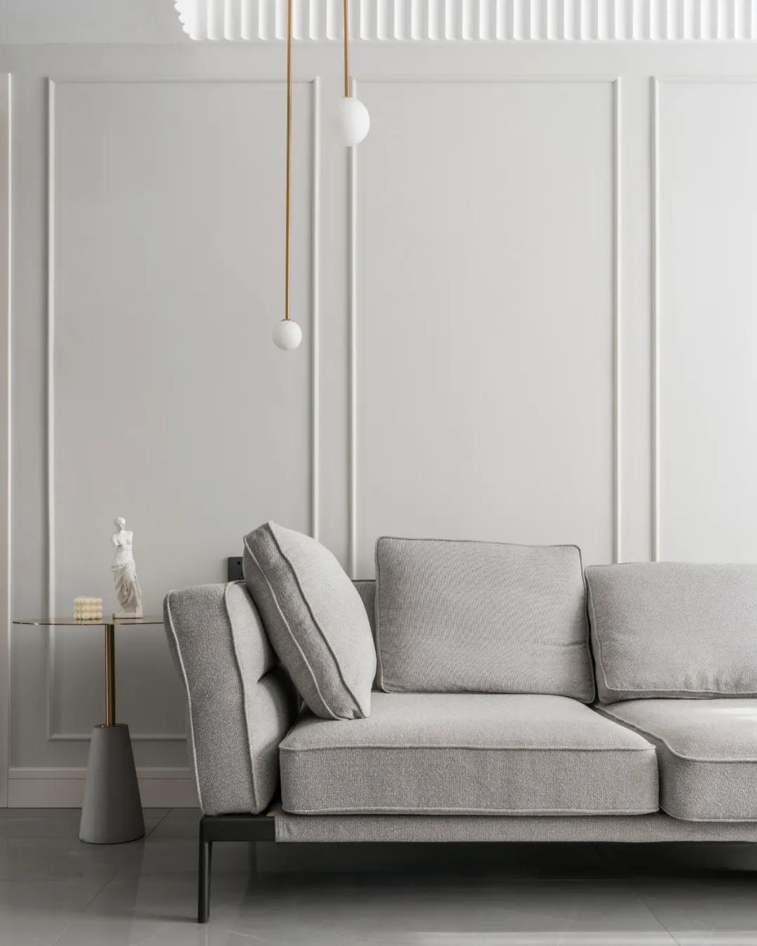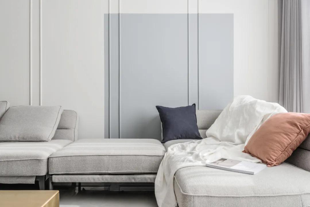 ▲沙发墙在浅灰色的基础加入边框线条,还在中间加入一块深灰色,在简洁的空间带来更加丰富的层次感。