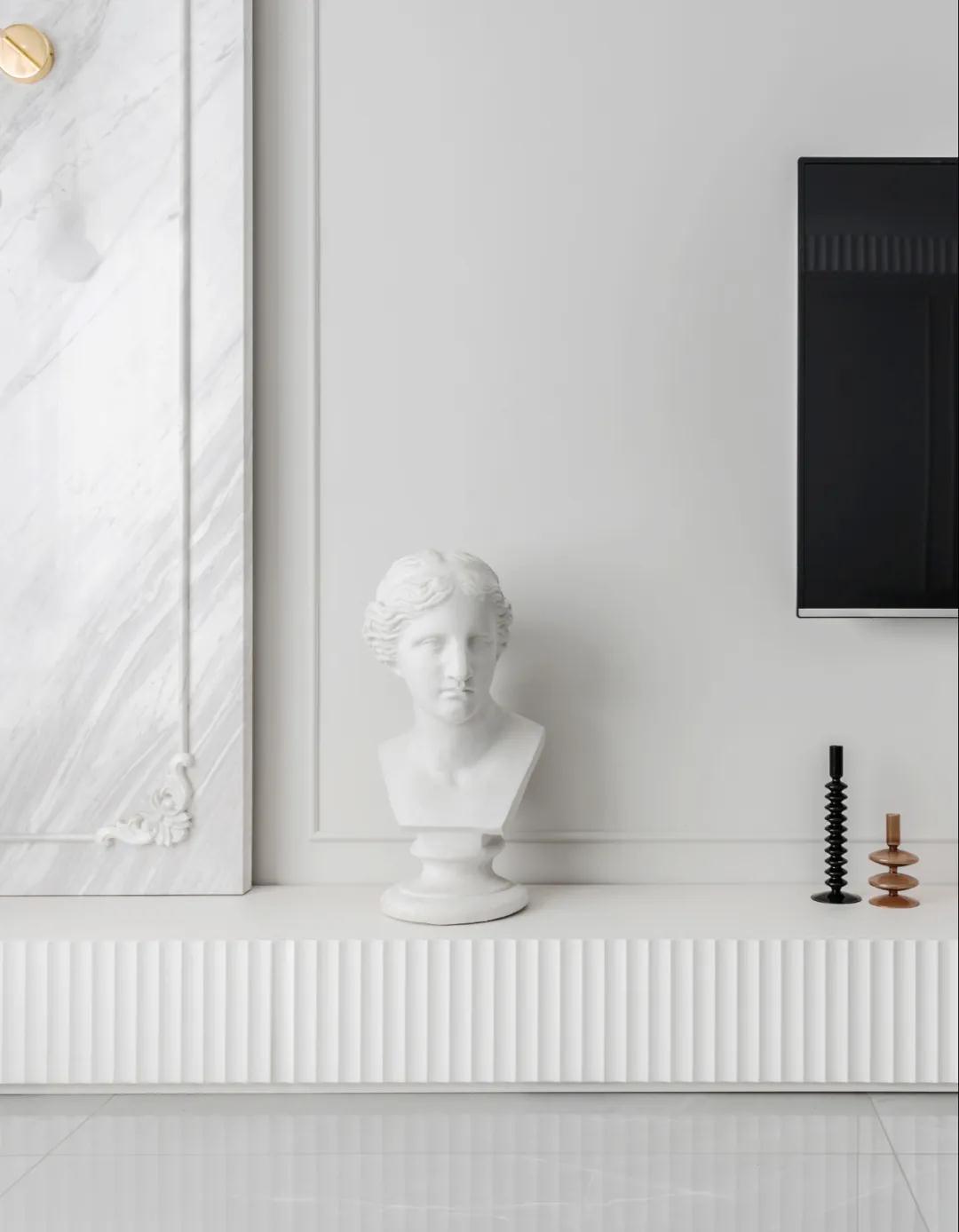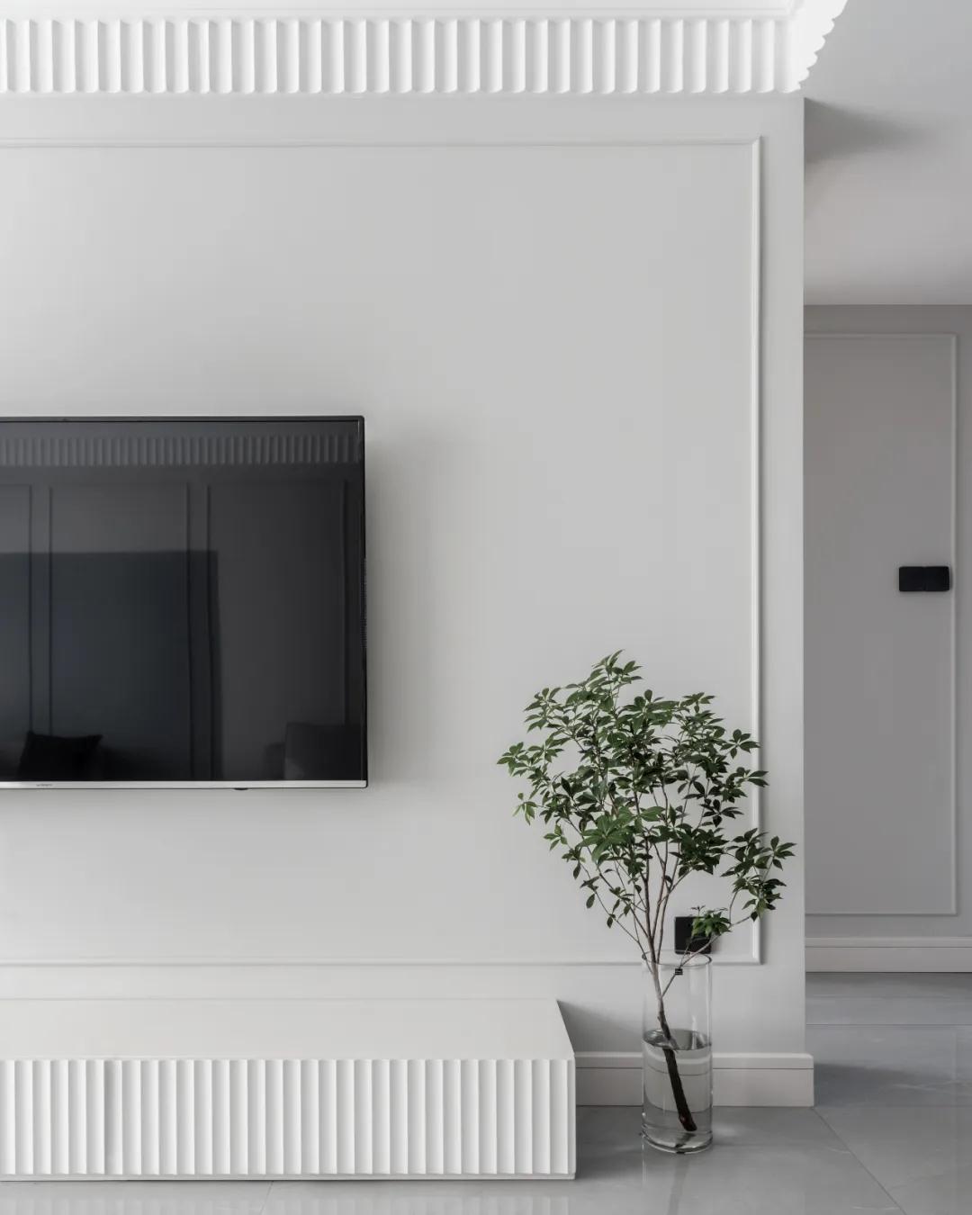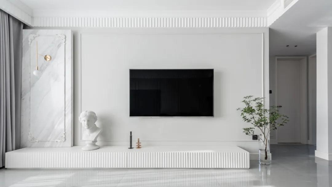 ▲电视墙以地台式的设计,左侧是大理石造型,整个乳胶漆刷的电视墙加上一圈的装饰线条,带来的空间感也是格外的舒适自然而高端。