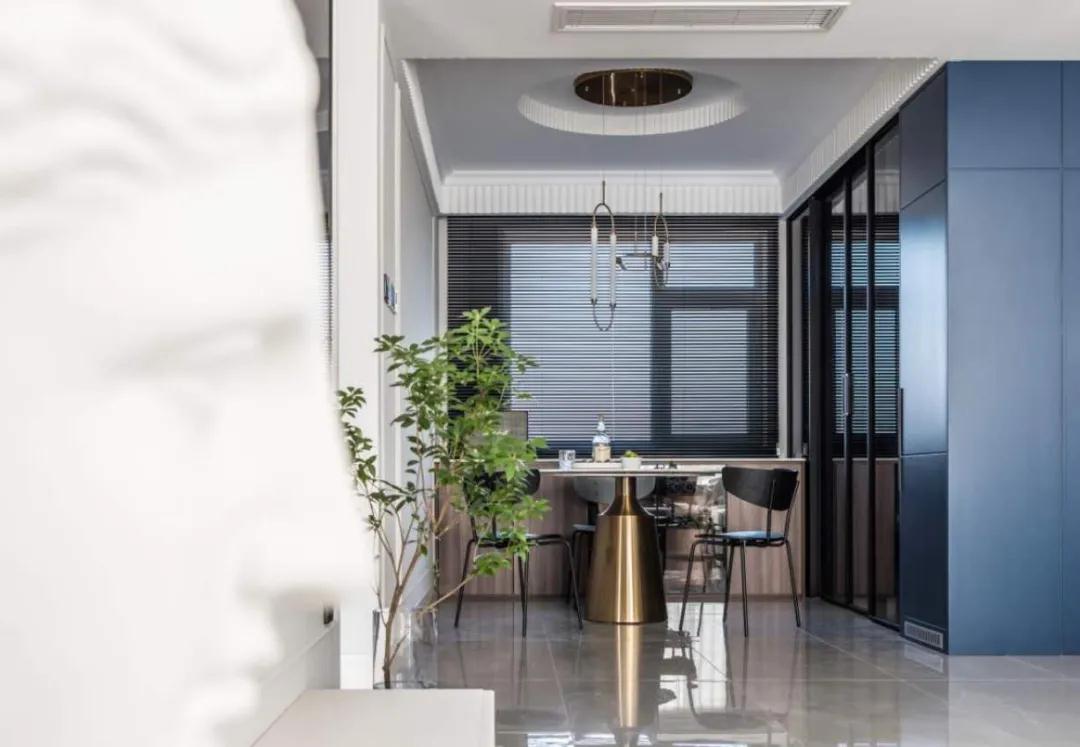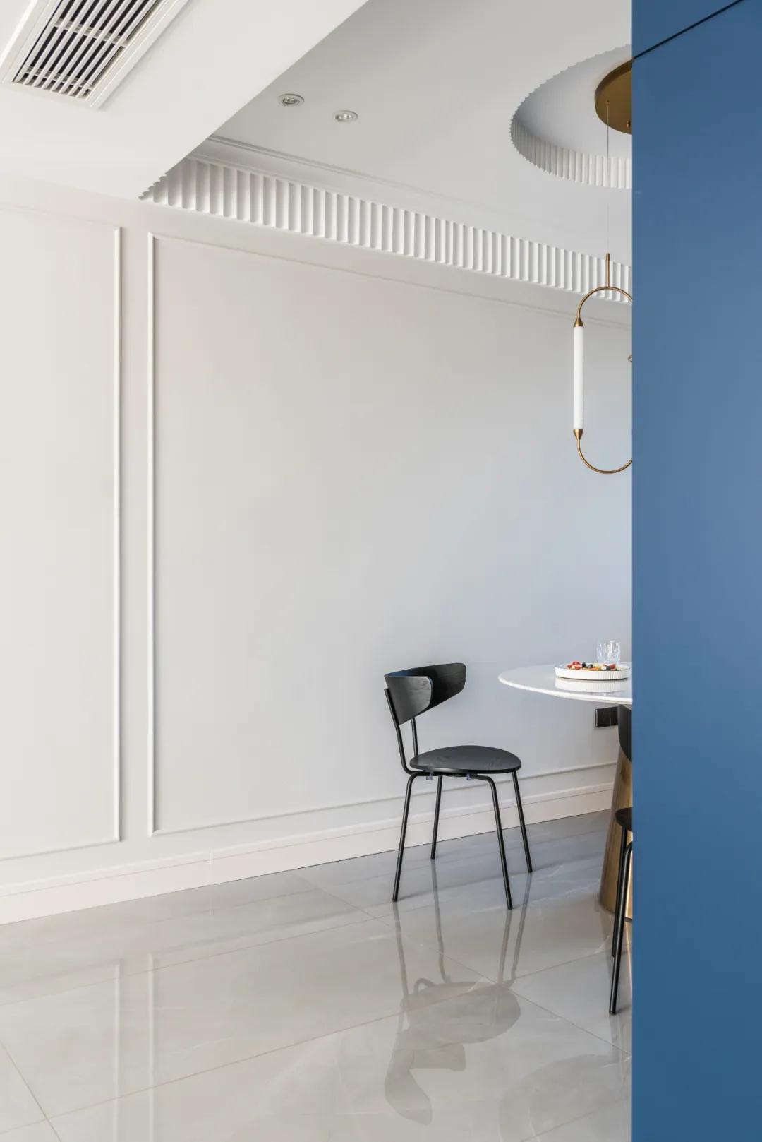 ▲餐厅整体空间不算宽裕,布置金属脚的大理石台面餐桌,搭配黑色餐椅,黑色厨房门与蓝色的冰箱柜,整个空间充满安静与端庄的稳重感。