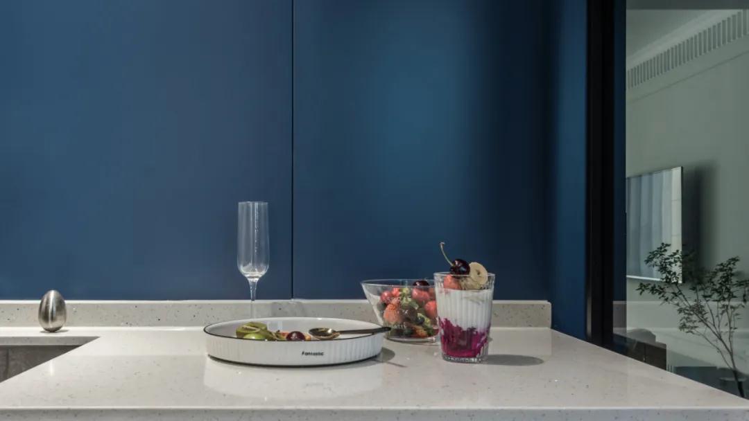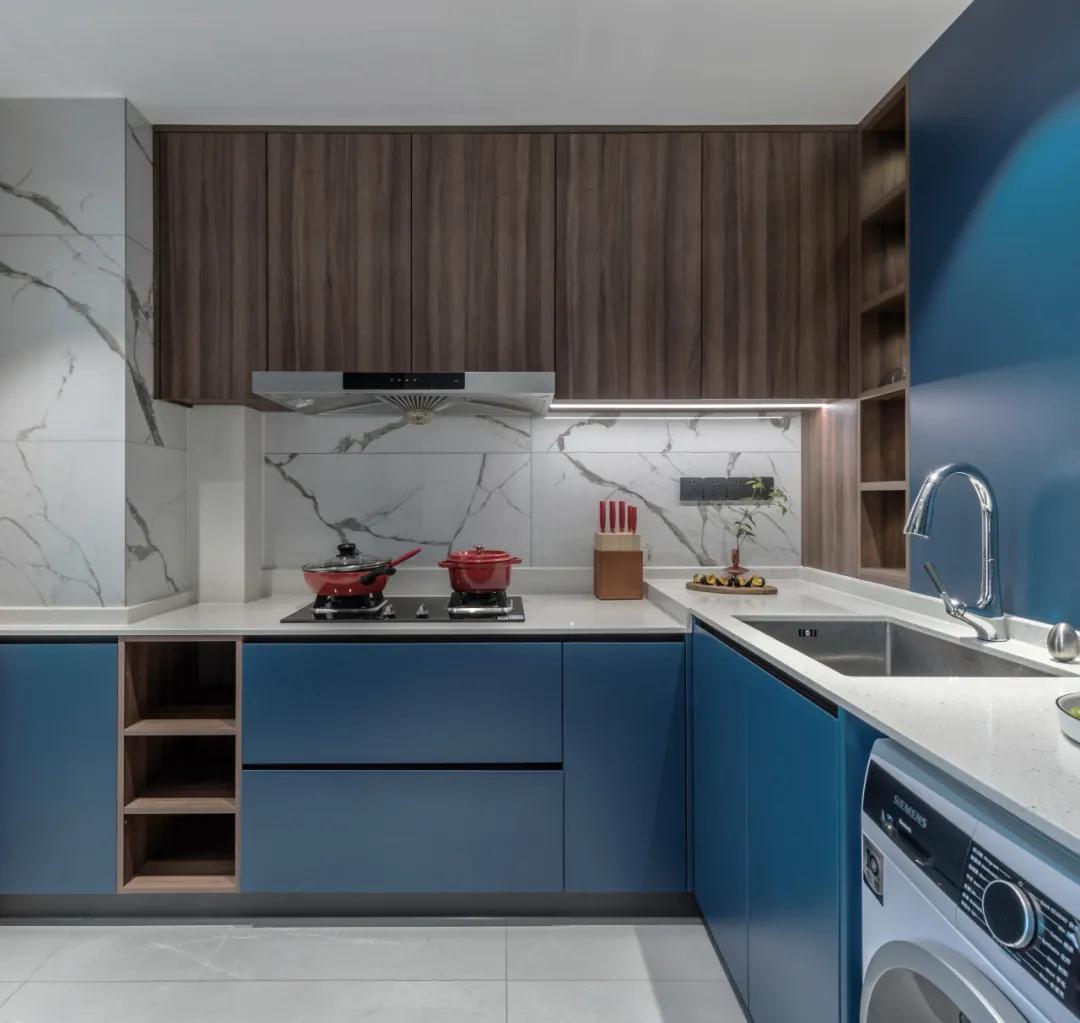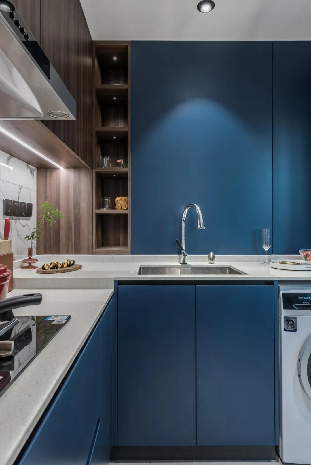 ▲厨房以蓝色定制橱柜,结合雅白的墙面与木色的吊柜,使得做饭的空间也更加安静优雅。