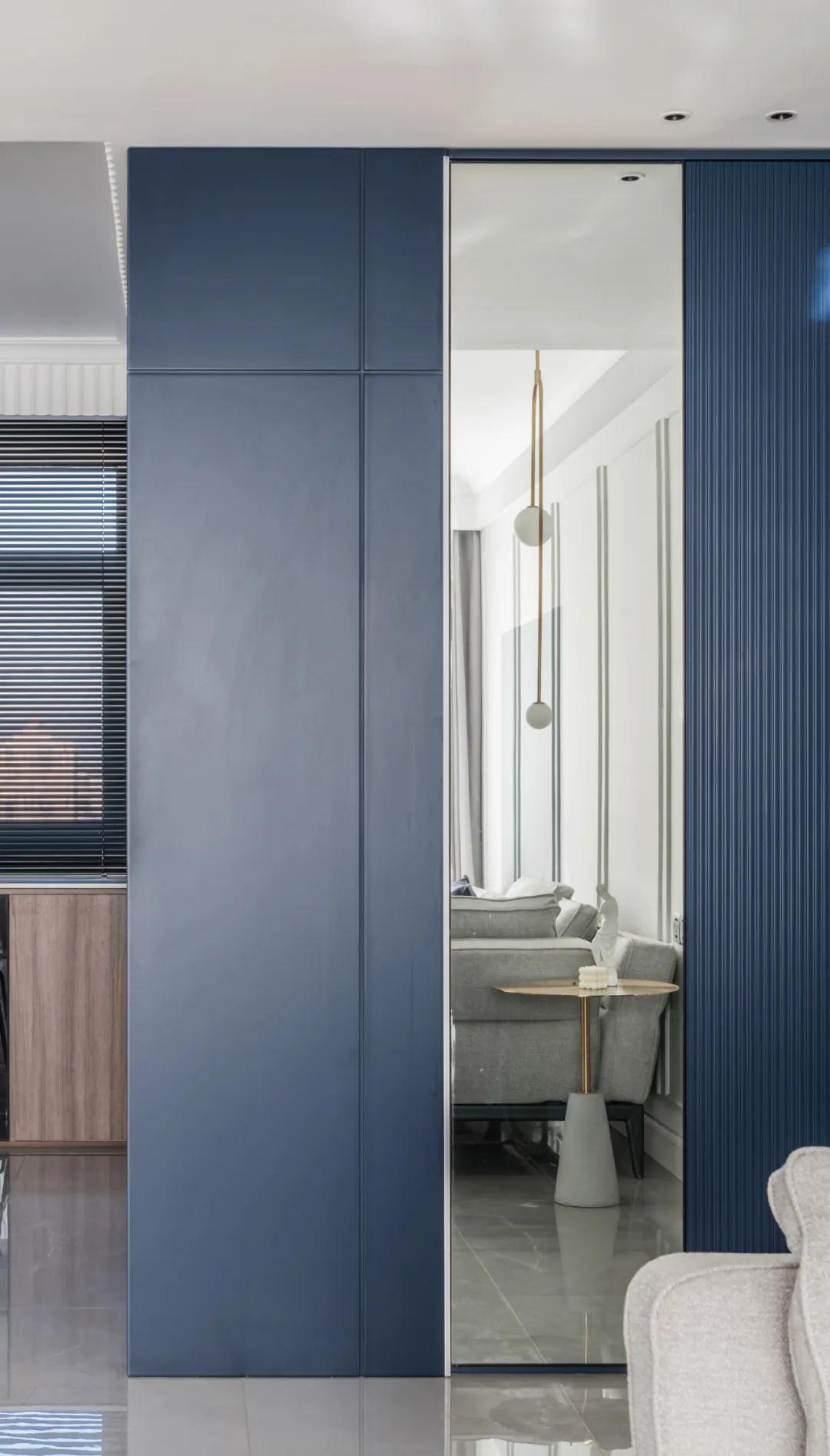 ▲蓝色的过道墙面,加入一面全身镜,为进门处提供了换鞋的方便。