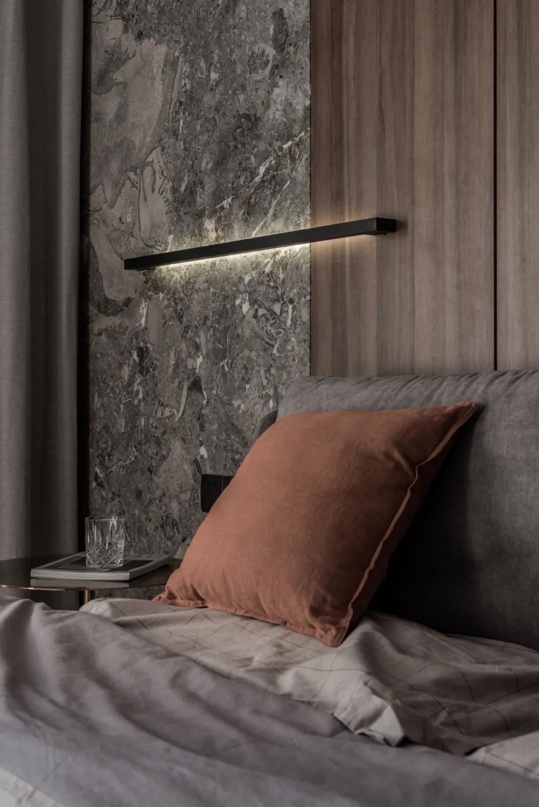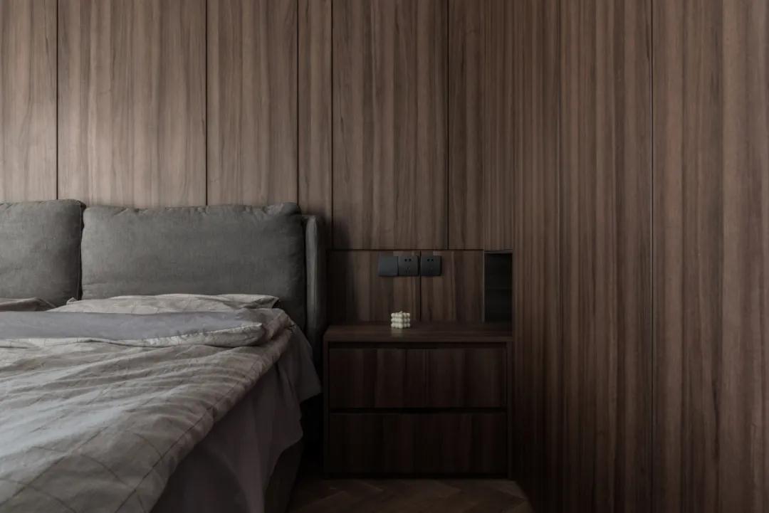 ▲床头墙以木饰面的背景,布置暖灰色的床铺,整体空间充满成熟与安静的端庄感。