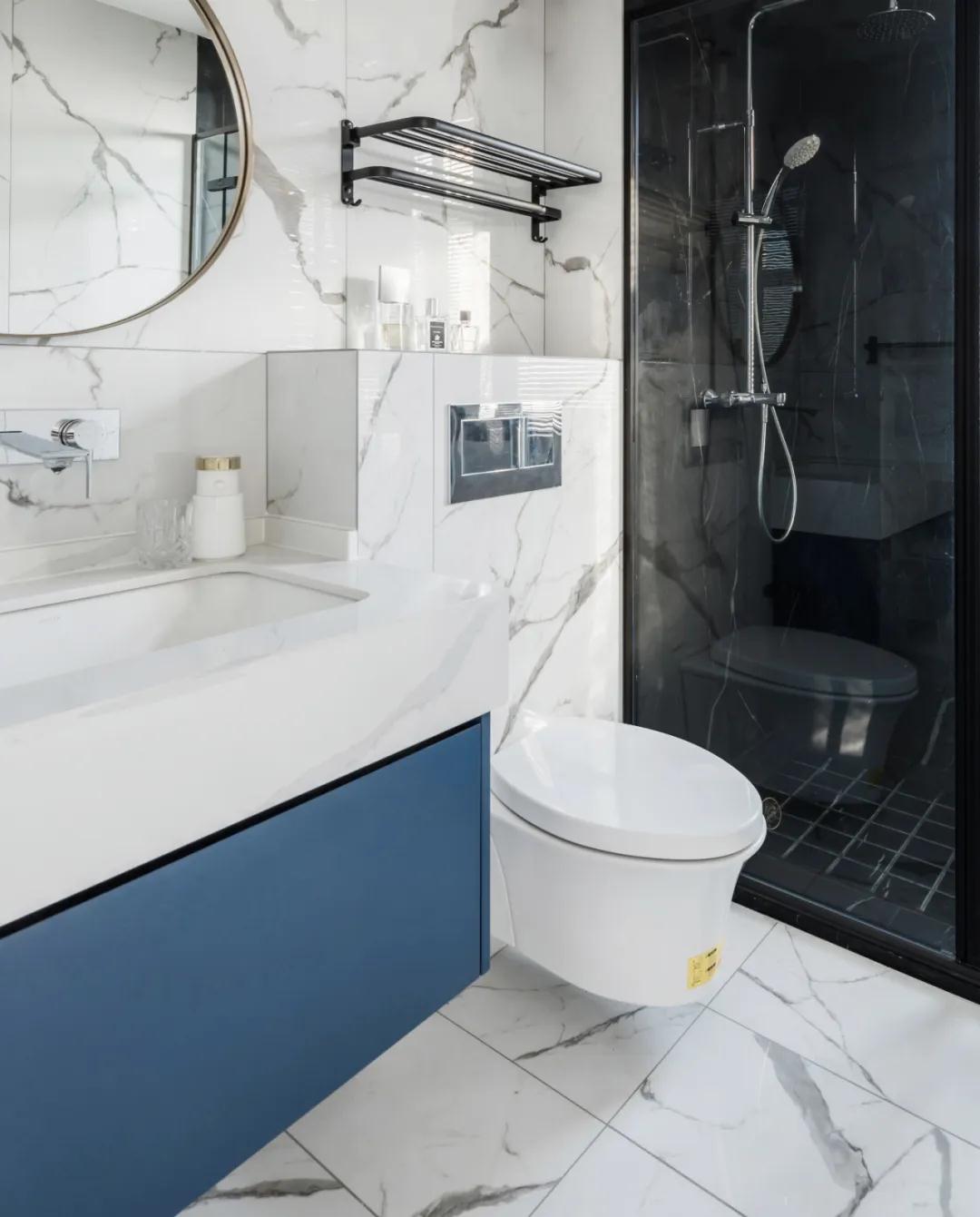 ▲卫生间壁挂式马桶的设计,后方多出了一个摆放卫浴用的台面,在台面上方装上毛巾架,小空间利用而更加实用。白色墙面地面,结合蓝色浴室柜,还有深色的淋浴房,使得卫浴空间也优雅而端庄