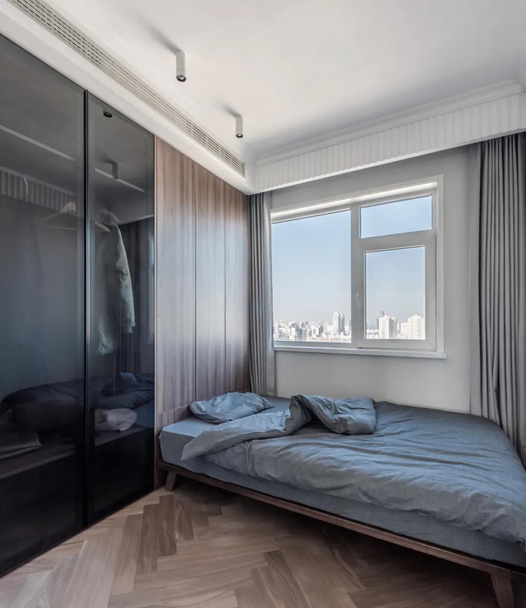 ▲次卧靠窗布置床铺搭配灰色床单,木饰面的床头墙,结合玻璃门的衣柜,让空间、收纳柜更加实用方便。