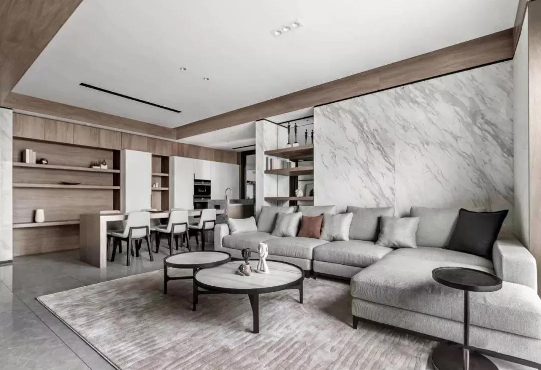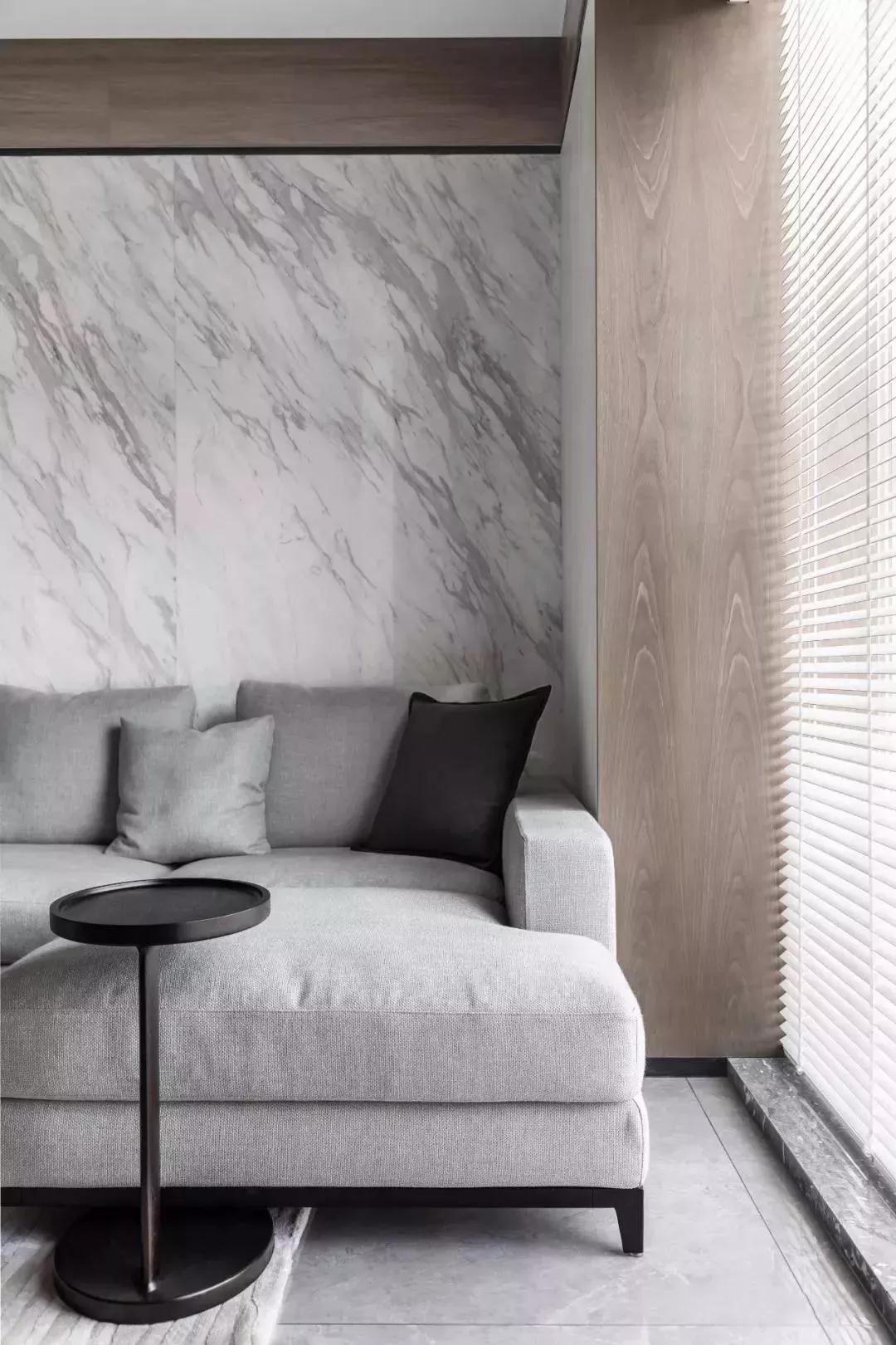 白色的大理石纹路与灰色沙发