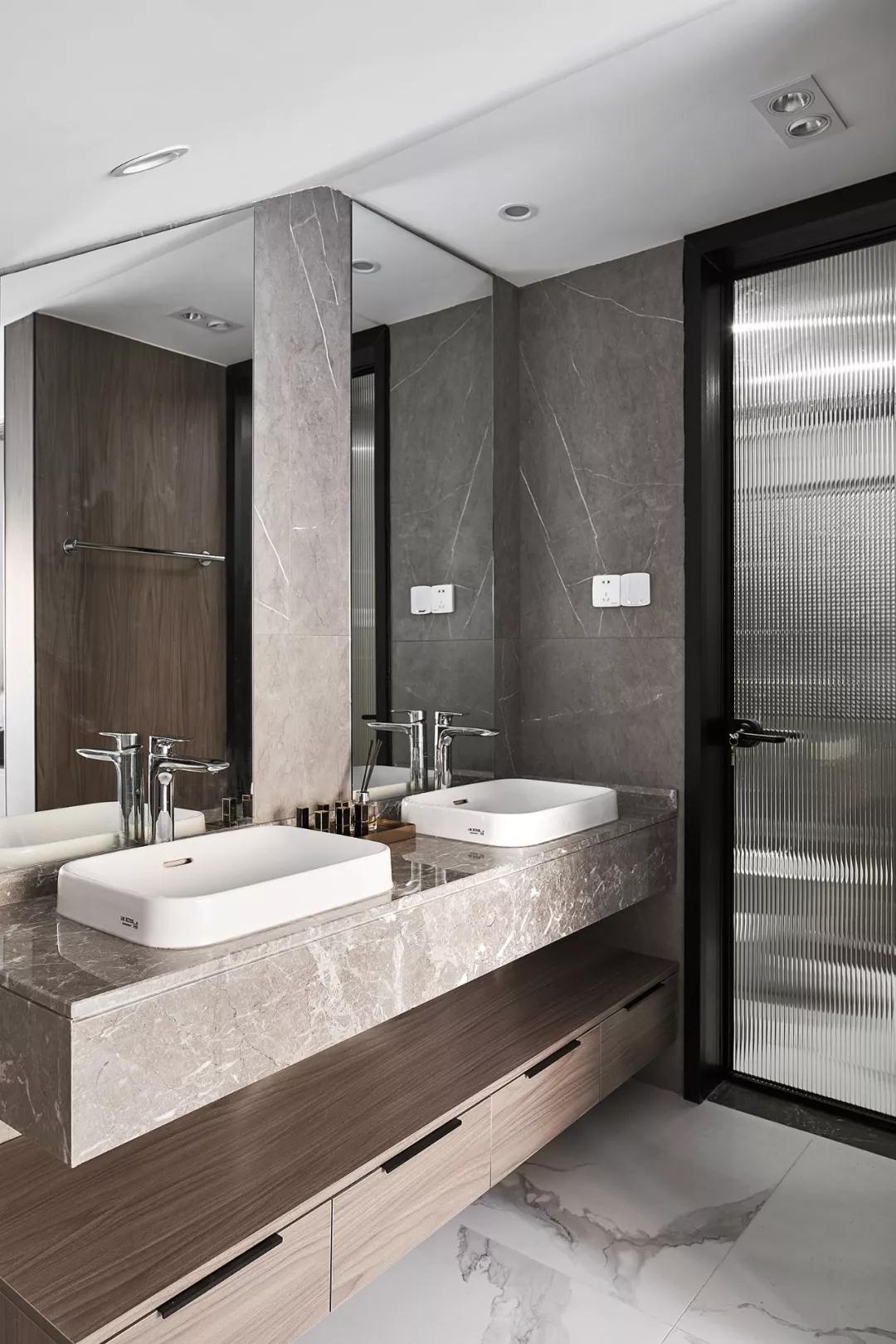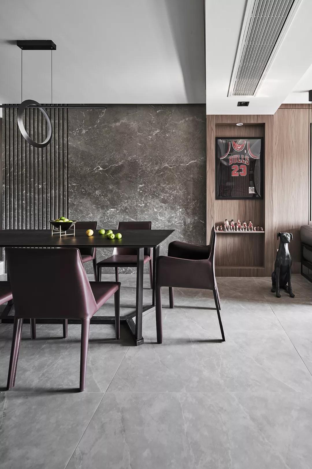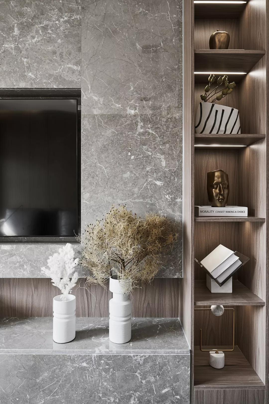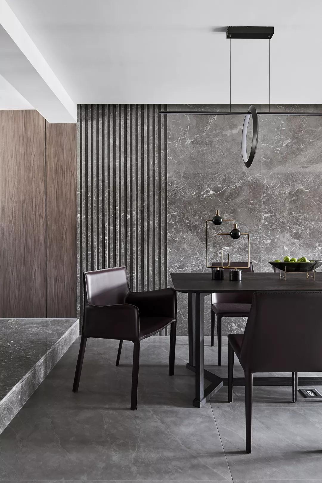 大理石与木饰面以自然原始的肌理,为空间注入无限生机,充满质感的皮质沙发和点缀的金属器皿与之呼应,以细腻的触感丰富了空间层次,以流利笔挺的线条美学和低度的颜色,将设计理念娓娓道来。
