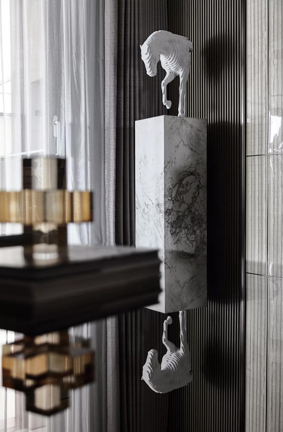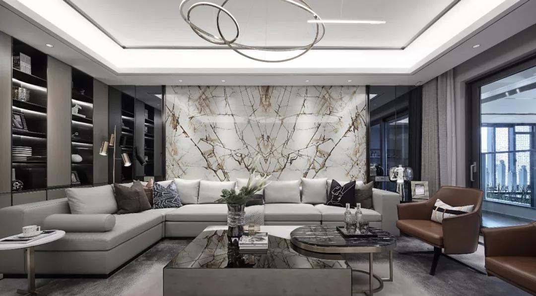 沙发背景使用大纹路石材拼接,两侧用灰镜装饰,视觉上扩大了整体空间的开间距离,也更加体现了整体空间设计上的精致感。天花造型与地面垂直线条相呼应,简单的装饰,让空间更加一体化。