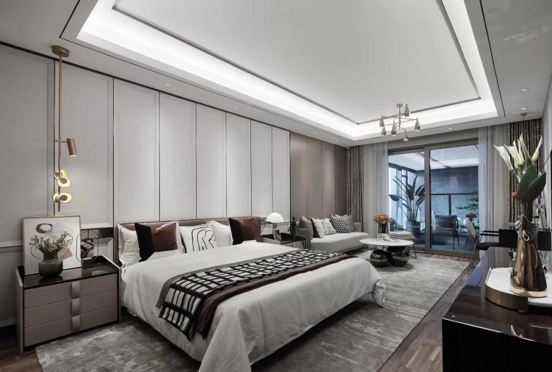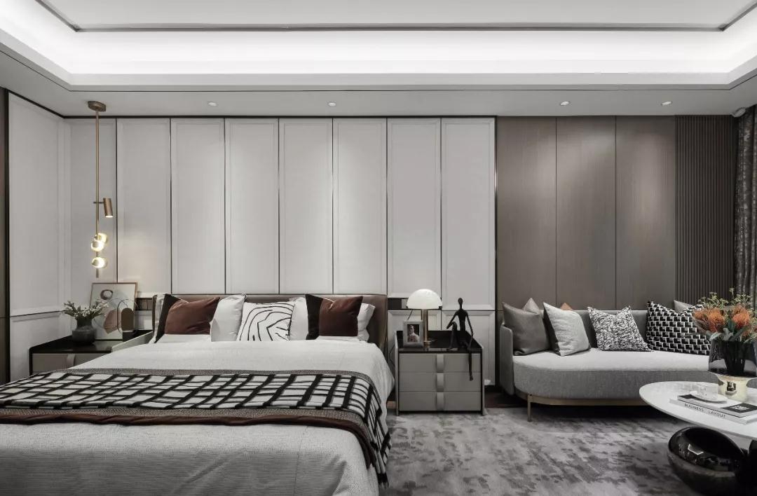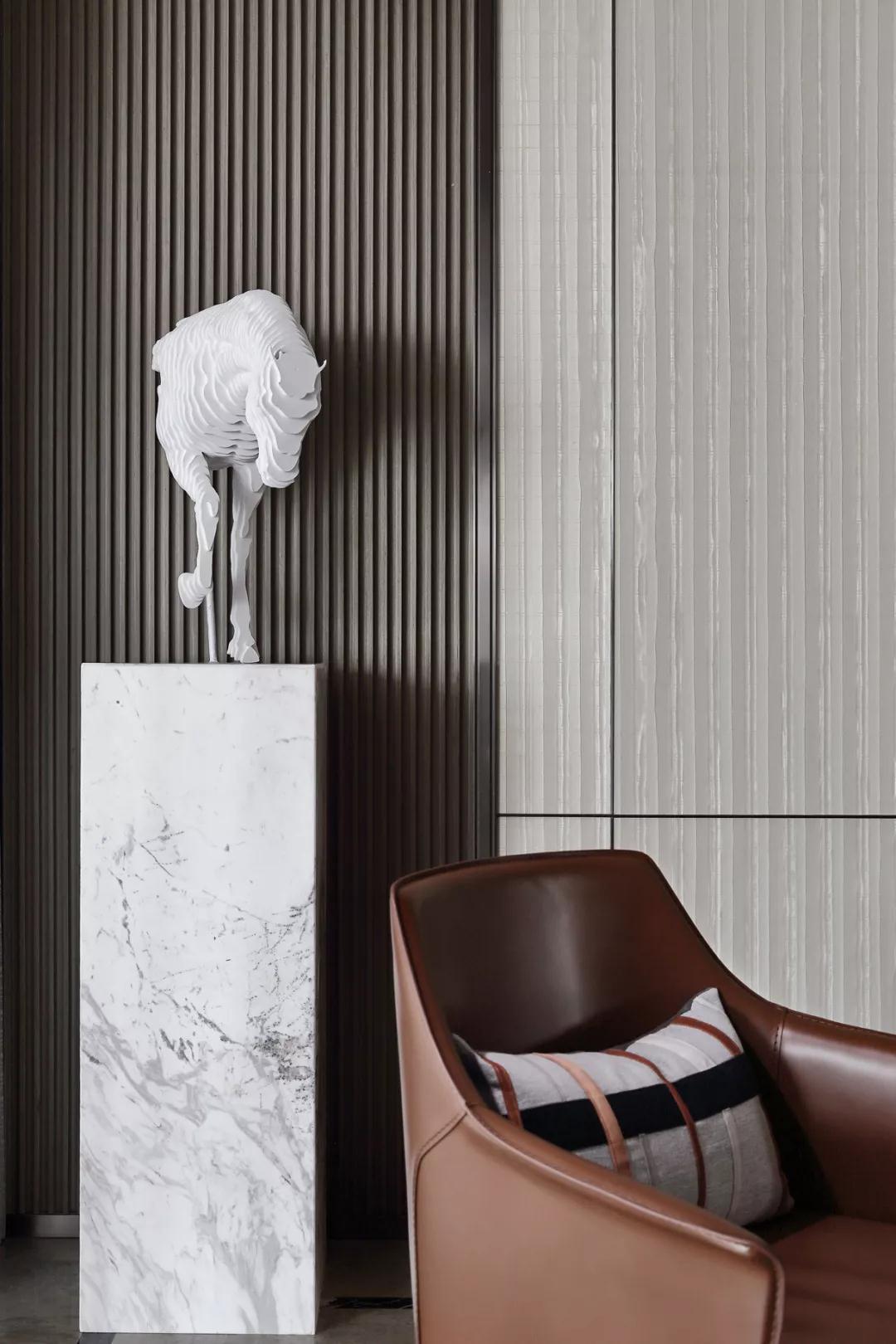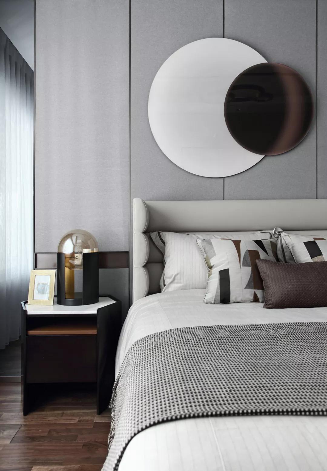 不同功能空间的主题打造,只为提升整个设计的品味和韵味。进入卧室,私人领域缓缓展开。主卧设计上,剔除了繁琐的造形,通过块面化的手法进行塑造。床头大块的皮革硬包与精致的不锈钢条进行碰撞,使空间安静而不失品质。