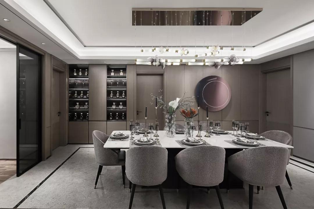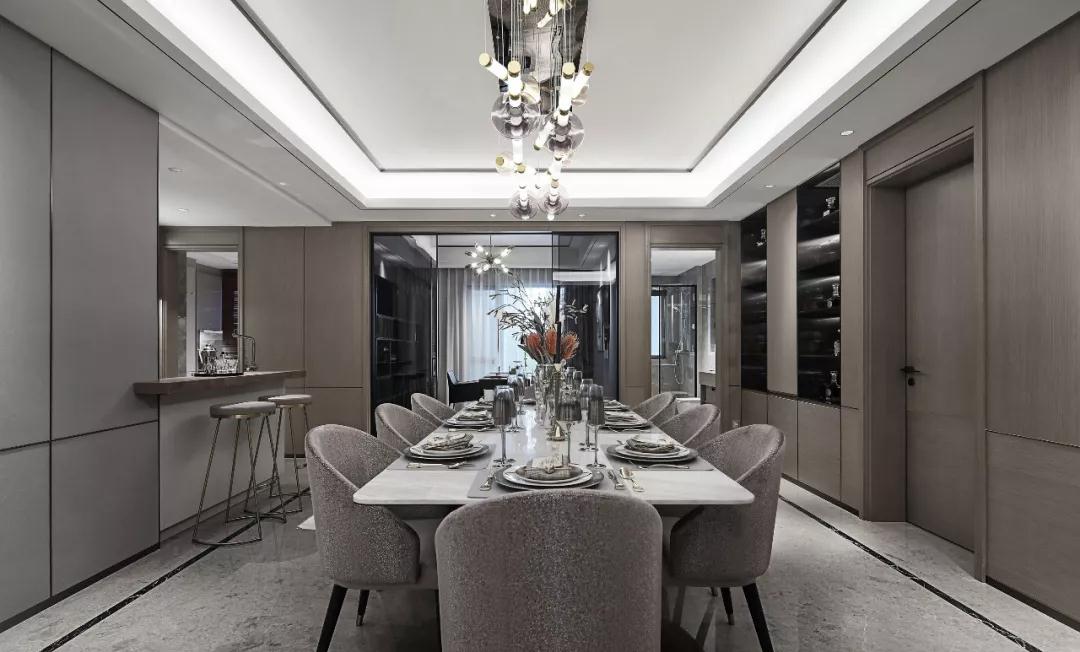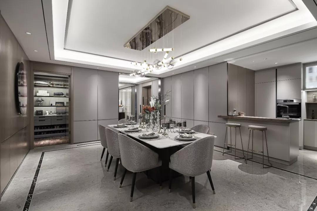 南北通的客餐厅空间布置,开阔了居者的视觉感受;全大理石地面,彰显品质。吧台与餐桌的双设置,不仅方便了一家人其乐融融的聚会交流,更提升了空间的尊享感。