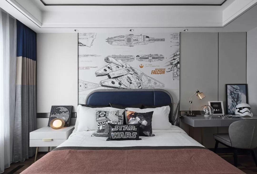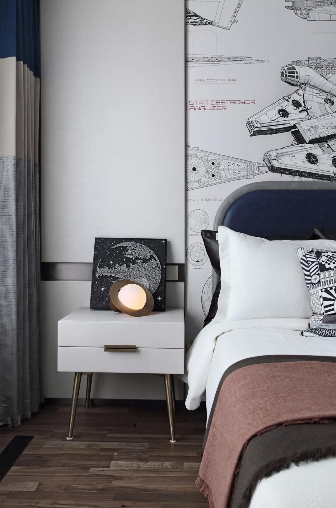 男孩房的设计以“漫游太空”主题贯穿整个空间,主题饰品的点缀不仅体现了孩童时代大胆的想象、探索,充满活泼动感的特质,也隐喻了对生命纯真、本质的永恒,追求美好的愿望。