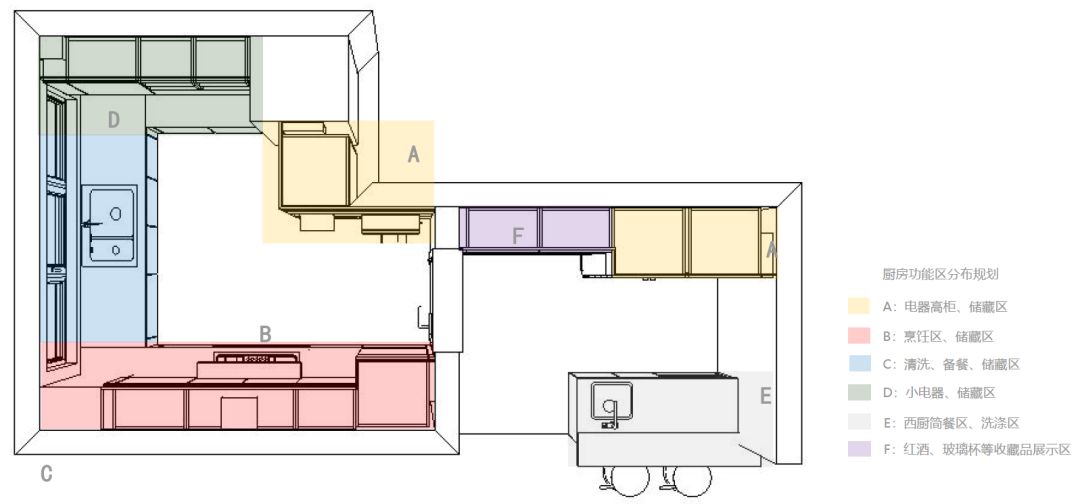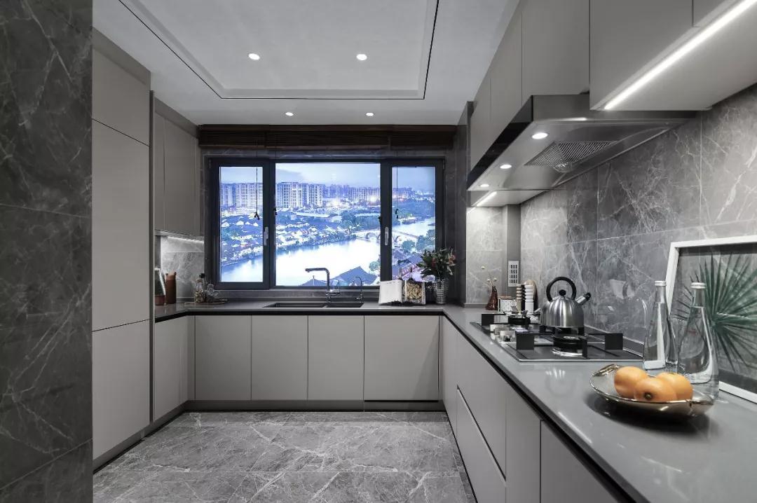 设计师对厨房空间进行了整体规整,加以灵活使用,增加烟机筒两侧的储存空间,设置吊柜内暗藏插座等。