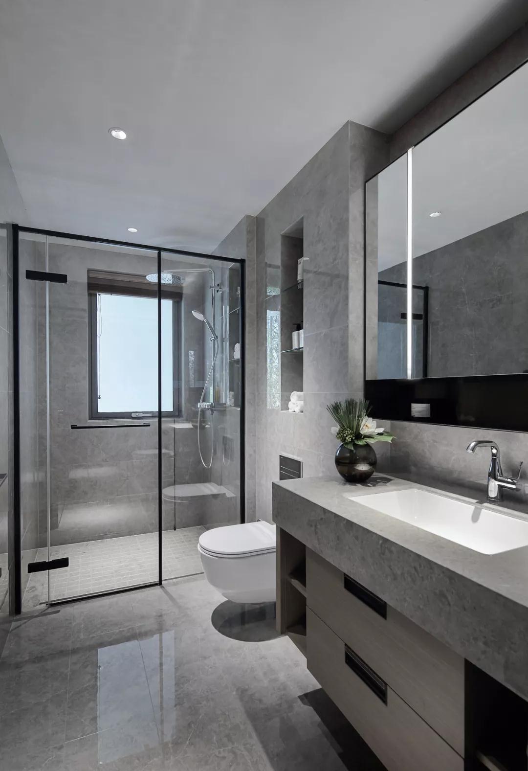 客卫空间,运用大理石石材加以金属分割完美遮蔽毛边,台盆镜则以长方形的样式,充满线条感,让卫浴时刻更趋轻奢。