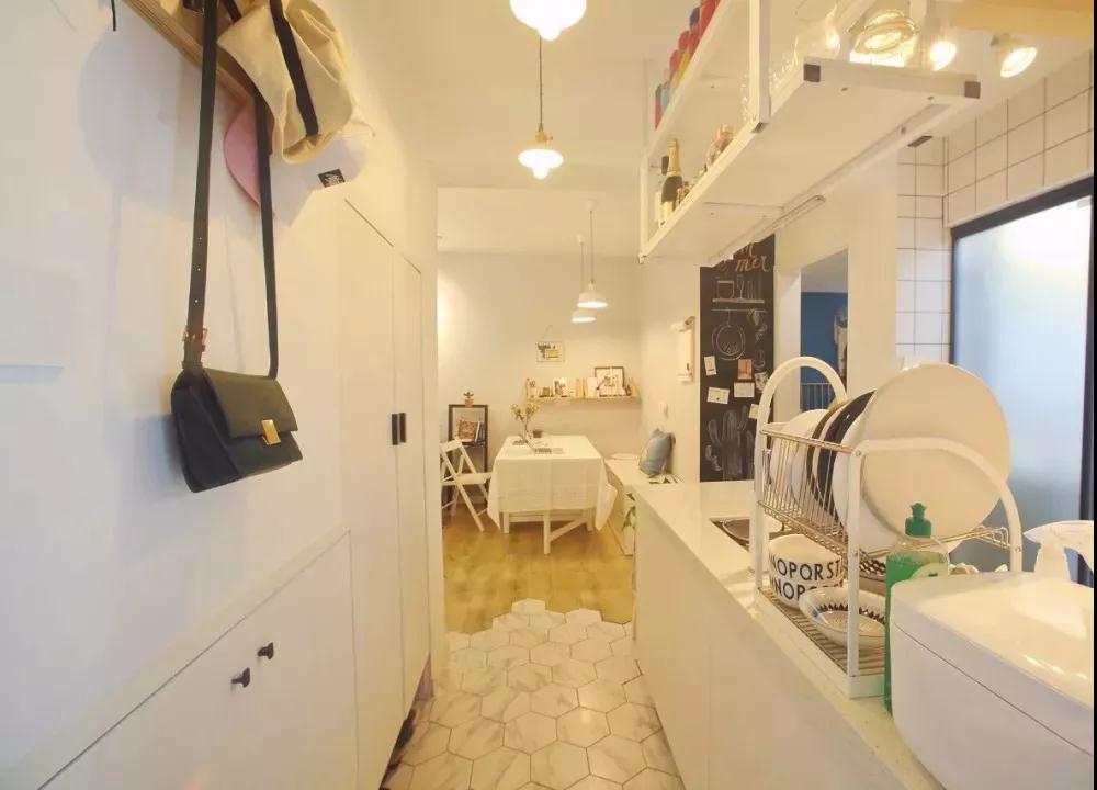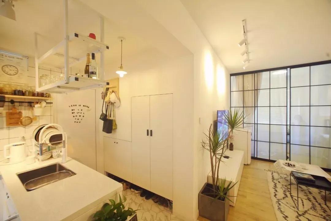 进门后左手边是嵌入式的鞋柜,右手边是厨房,正前方是客厅,布局合理。