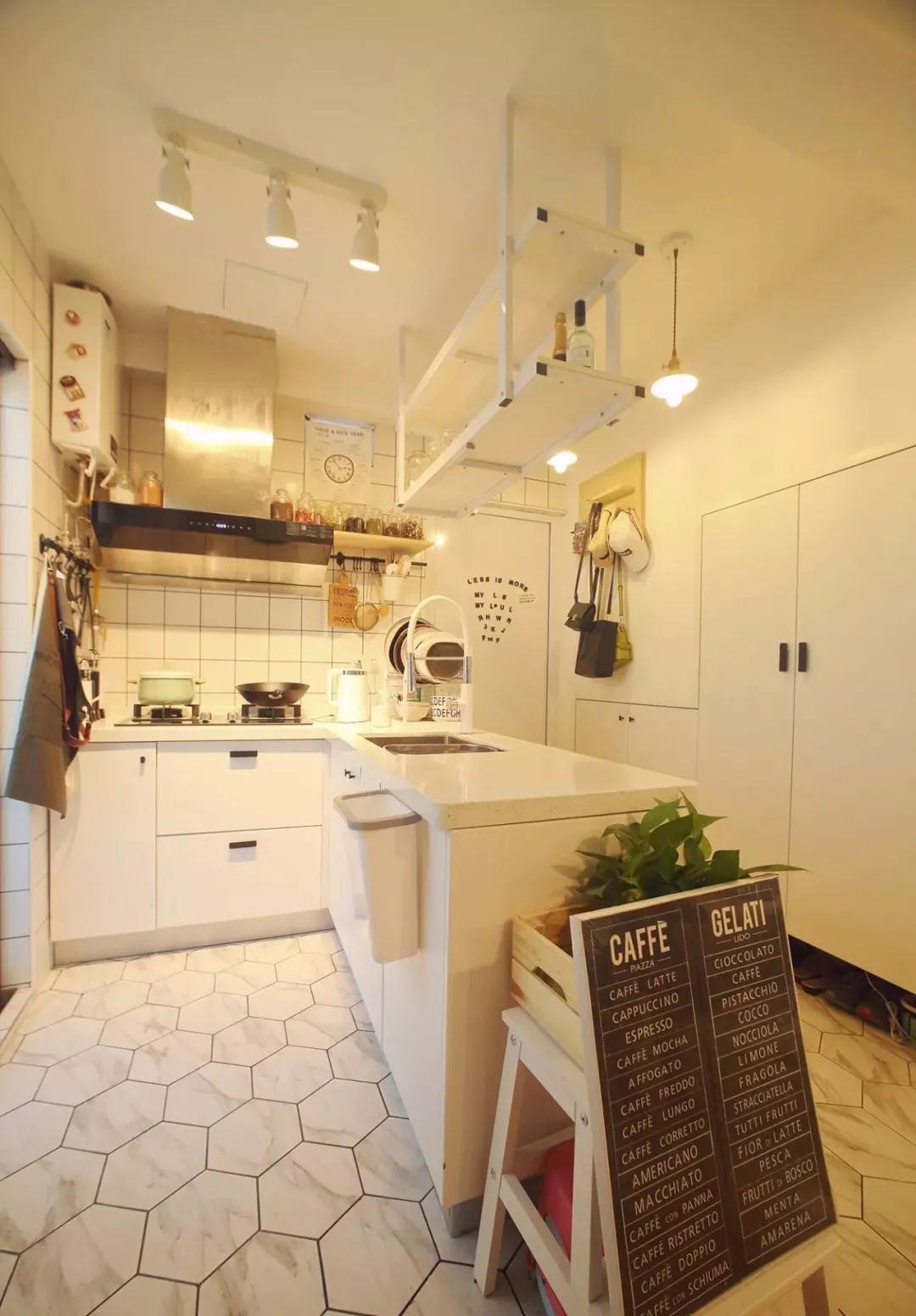 开放式的厨房,六边形的地板,zui耐思的设计是切菜区域的旁边,设计了一个小型的垃圾桶,这样在清理台面的时候,就非常方便了。
