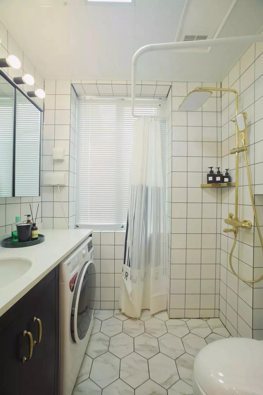 受户型面积大小的影响,干湿分离,没有设计墙面作为隔断,而是利用了可以拉伸的浴帘,好看又实用。