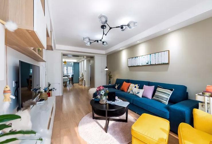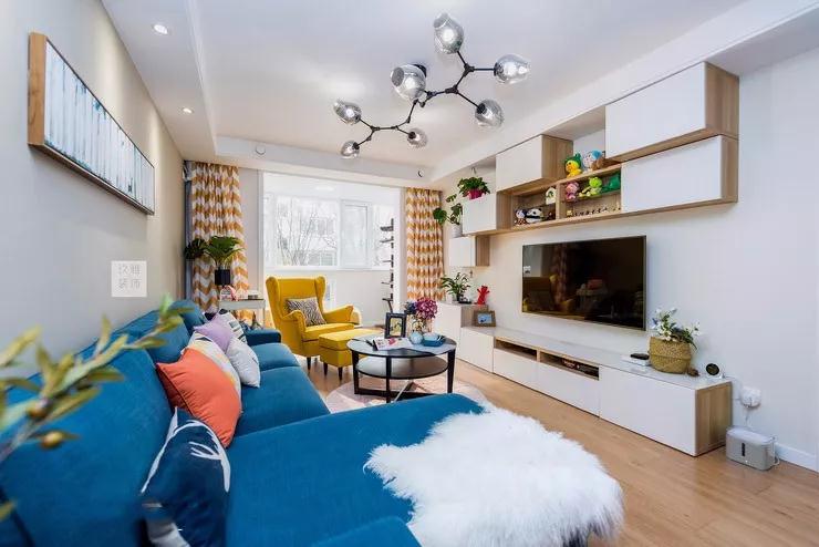 大面积咖啡色墙衬托湛蓝色沙发,沙发是经典的黄蓝搭配,色彩明亮,在视觉上让人感到十分舒适。