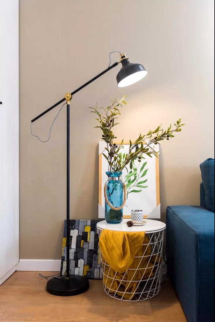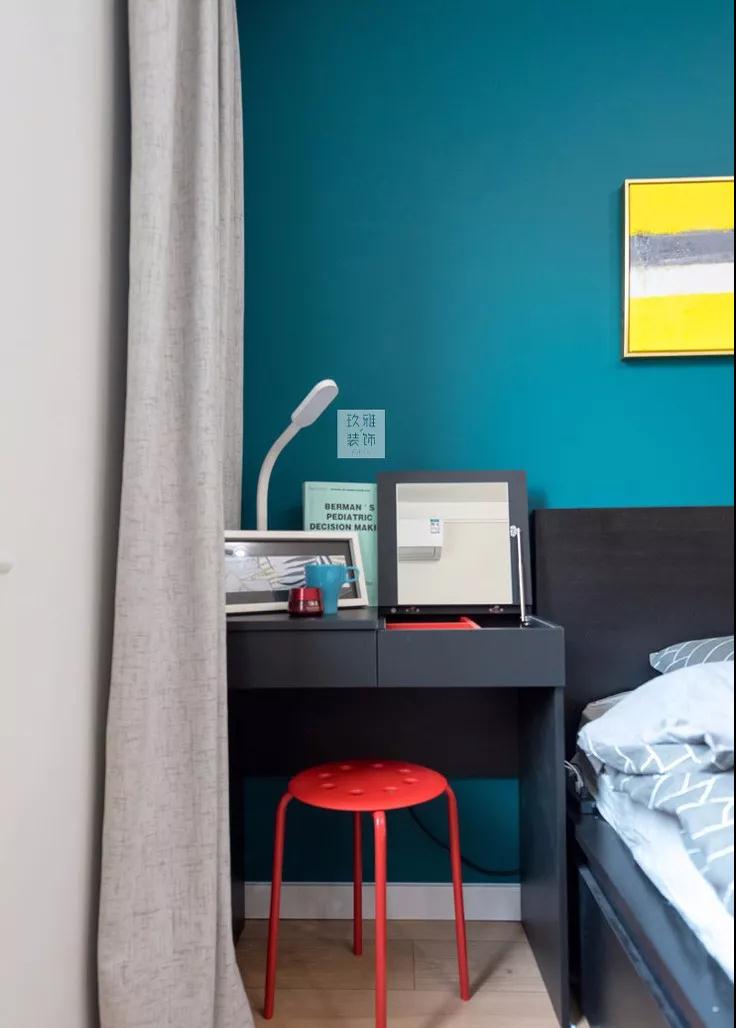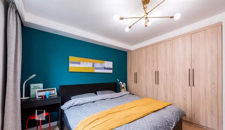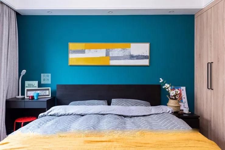 主卧用色比较大胆,深蓝色墙面搭配黄色挂画、木色家具和地板,亮丽的空间色彩让空间生动活泼,不会让人觉得压抑沉闷,很适合卧室。