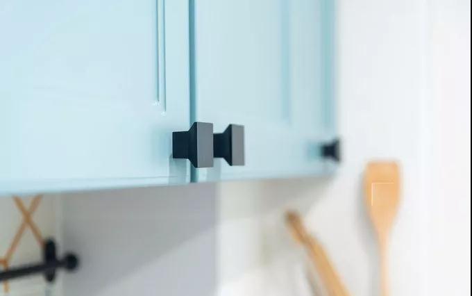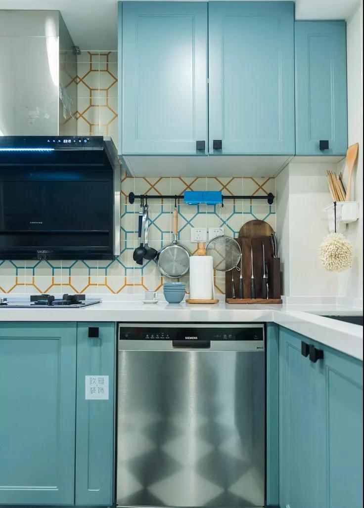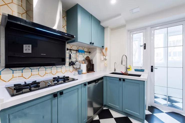 厨房延续了原始的L型橱柜,大面积采用蓝白色,墙壁使用几何图形瓷砖,黑白色地砖斜铺,营造空间立体感。