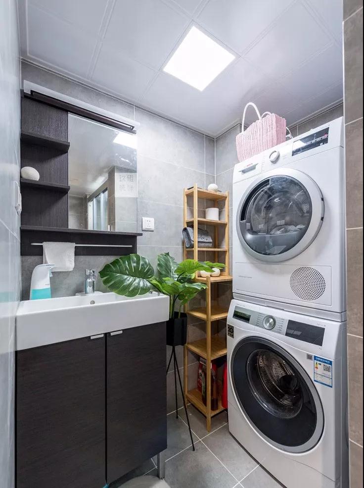 改造后的次卫洗漱区,开放式镜柜更加方便了业主取放洗浴用品。墙角采用置物架,增加储物空间。洗衣机和烘干机的搭配让阳台不再挂满衣物,可以更多地满足生活情趣。