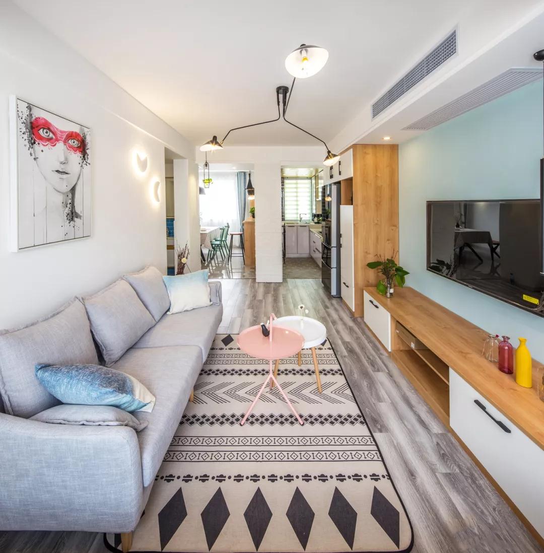 ▲简约自然的客厅,电视墙是一个简约自然格调的电视柜,侧边还有一个高柜,在淡绿色的墙面基础,在黑白配的几何图案地毯上摆着两张粉白配的小茶几,布置出一个雅致端庄的氛围感。
