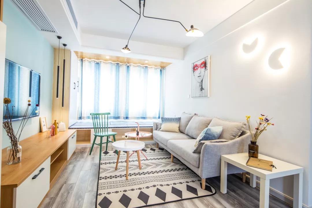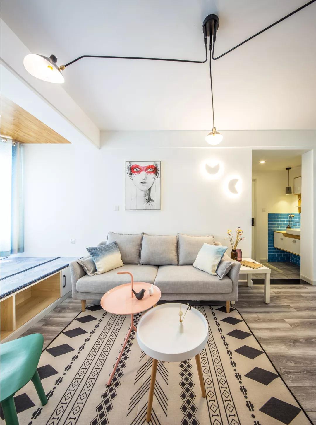 ▲浅灰色的布艺沙发,布置出一个简约年轻的舒适感,靠窗还定制了榻榻米,充当了临时的睡眠区域,也可以作为客厅的坐席位置。