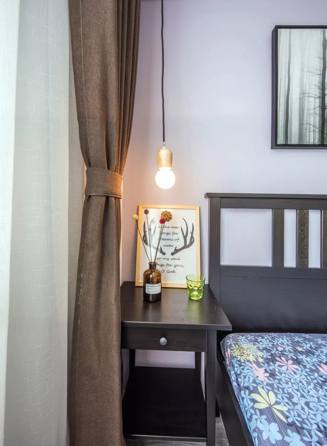 ▲床头柜上的花瓶、装饰画与一张吊灯,在细节处也布置出温馨自然的档次感。