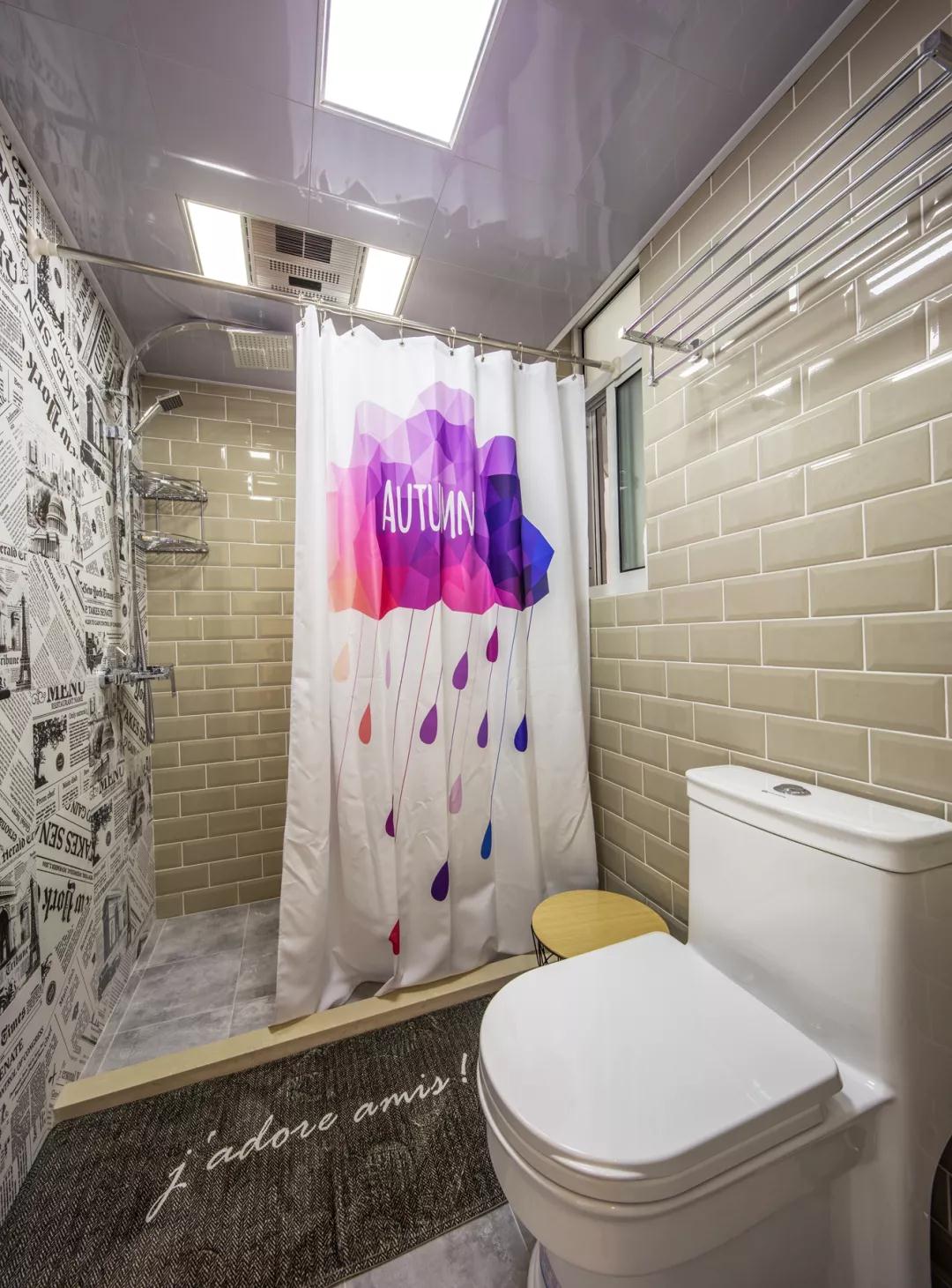 ▲卫浴区的墙面砖在暖灰色面包砖基础,安装花洒的这面墙则是以独特的报纸图案纹理的设计,淋浴区外铺上舒心的地毯,超大化地保障居家空间的干湿分离与安全。
