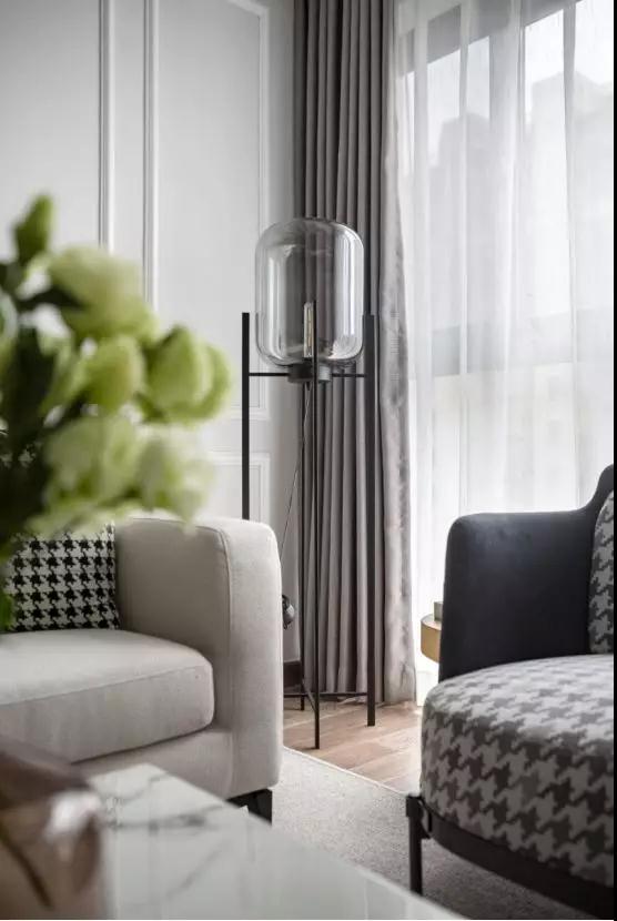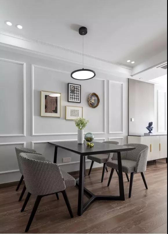 多种材质的运用让空间层次感更加丰富,科定板,晶瓷画,千鸟格纹样等无不透露出整个空间的精致感和时尚感。