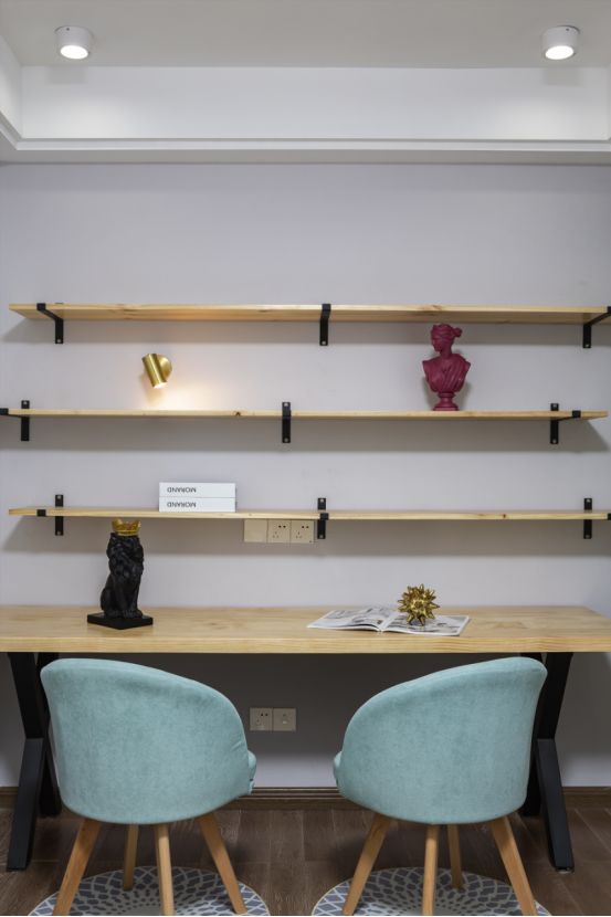 儿童房则采用了比较跳跃与活泼的色彩,更加有童趣。兼具工作和辅导的双人书桌应该是对这个家和睦的更好体现吧。