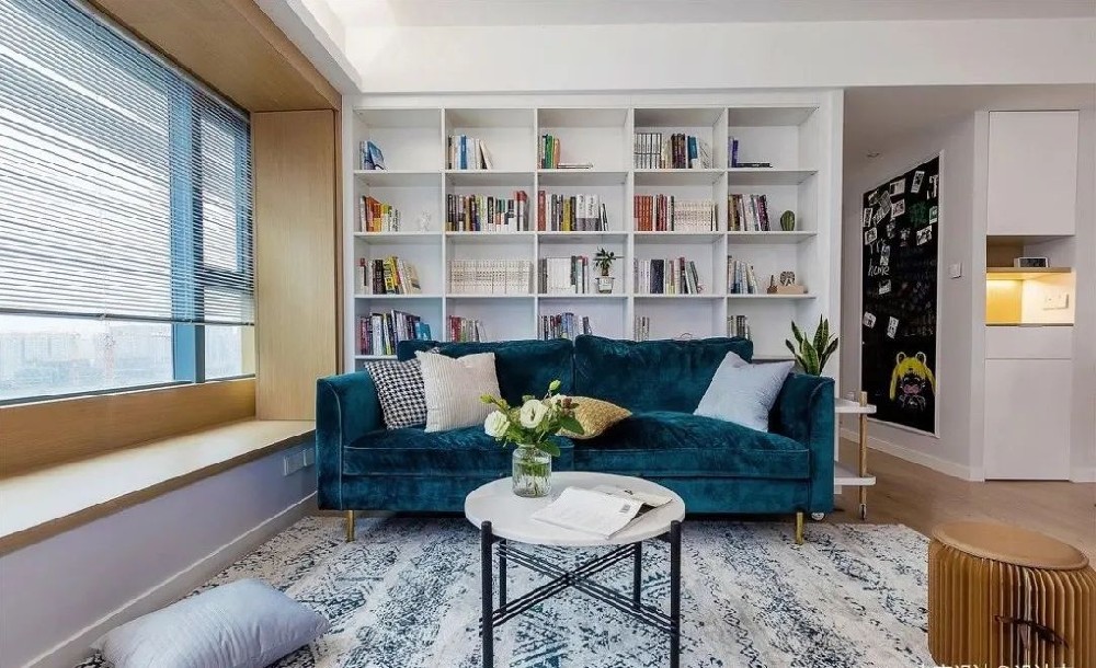 小编以前看过的沙发基本都是靠着墙根儿放的,这样的摆放方式基本上每个家庭常见的固定样式。后来看了很多案例才发现沙发往前挪些距离,将沙发和墙分开,空间反而更加开阔,沙发和墙之间的空间也能充分利用起来。01沙发后:整面墙书柜沙发往外挪10~20cm的距离,多出的空间完全够做一个书柜,书柜不一定要占满整墙,如果客厅面